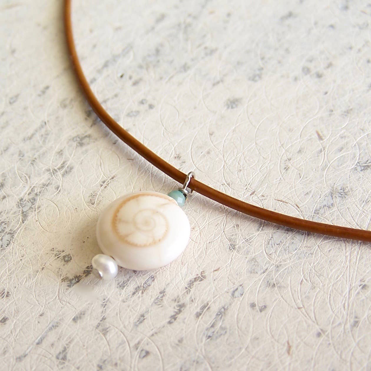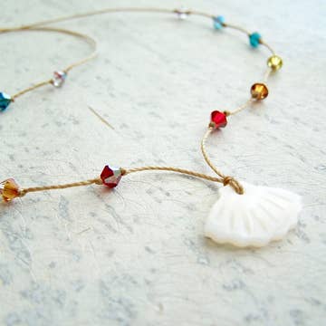 I made the original Aloha Necklace with a perfect clam shell I found on the island of Kauai. Inspired by the Hawaiian rainbow state, I used the beads I had with me to string together a rainbow of Swarovski crystals, and the necklace instantly became one of my forever favorites. I love how the beads are bright and cheery, but much more subtle than you'd think when you wear it (I normally live in neutrals). I hunted the world over and found a wonderful carved Mother of Pearl scallop shell to reproduce my own piece in hopes it will become one of your favorites too! MOP pendant and Swarovski crystals on nylon cord. 17” including pendant. May request longer length.