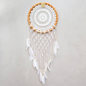 Handcrafted with care by our artisans here in Bali, this wall hanging dream catcher brings a dreamy touch to your sacred space. A perfect decoration for nursery room, boho wedding and party, or simply use it the traditional way. Let the good dreams get trapped in the web, then slide down the feathers to you... Material : rattan, cotton, goose feathers Dimension : (Medium) : 22 x 60 cm / 8.6 x 23.5 inch (Large) : 32 x 80 cm / 12.5 x 31.5 inch --- dreamcatcher dream catcher macrame tassels wall hanging boho bohemian home decor nursery bedroom decor kids wedding yoga