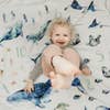 Paired perfectly with the Alphabet Blanket, our brand new Numbers blanket features watercolor ocean animal in groups of 1 to 10, with modern watercolor waves patterns on the back. Machine washable. 100% cotton muslin, 47 x 47 inches, 4 layers of softness. Two loops along top corners for hanging as wall tapestry. Packaged beautifully for gifting. Designed in Portland, OR, ethically made in China in small quantity.