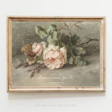 A gorgeous vintage painting of romantic blooms in soft, muted hues. Paired with the beautiful reminder of God's enduring, eternal love. Compliments modern farmhouse, french, cottage, rustic, country, boho decor. Perfect Christian or nature lover gift. * * Spring 2026 and Summer 2026 vintage and antique decor trend 𝐁𝐄𝐍𝐄𝐅𝐈𝐓𝐒 ● Popular sizes and canvas options ● Gorgeous full-color Giclée printing ● Small Christian family-owned business ● High-quality packaging/branding ● Made in the USA 𝐏𝐀𝐏𝐄𝐑 𝐏𝐑𝐈𝐍𝐓𝐒 ● Giclée printing on luxurious archival matte paper. ● Packaged in a protective sleeve with a sturdy cardboard backing. ● Frame not included 𝐅𝐑𝐀𝐌𝐄𝐃 𝐂𝐀𝐍𝐕𝐀𝐒 ● Striking floating effect adds depth and dimension. ● Thick archival canvas is carefully hand-stretched over solid wood stretcher bars, then attached to a wood floater frame. ● Wire installed, ready to hang. ● Frame: .55” width, 1.7” depth. ● Canvas: 1.25” thick. 𝐒𝐓𝐑𝐄𝐓𝐂𝐇𝐄𝐃 𝐂𝐀𝐍𝐕𝐀𝐒 ● Carefully hand-stretched over solid wood stretcher bars for a gorgeous gallery wrap. ● Sawtooth hanger installed, ready-to-hang. ● Canvas: 1.25” thick. Rooted in Truth creates: Christian Bible Verse art, Farmhouse Faith Decor, Faith-based Nursery Art, Baby, Vintage Revival, Neutral Good, Romantic Nostalgia, Cottagecore Decor, Soft Minimalism, Dopamine Decor, Hopecore, Slow Living, Meaningful Gifts, Artisan Gifts, Quiet Luxury, Preppy Aesthetic, New Romantics, Earthy, Fall 2025, Christmas 2025