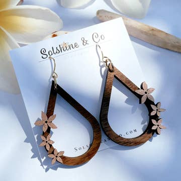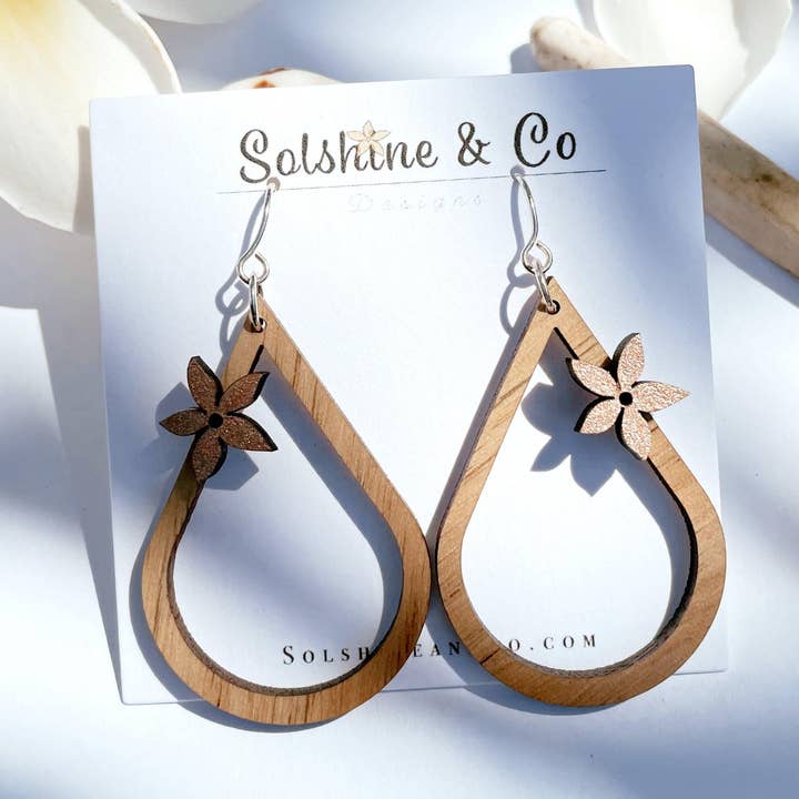 Our Plumeria Collection is inspired by the Hawaiian Tradition and Love of wearing a single flower (Pua) or flower Leis as adornments. * Extremely Lightweight * Exclusive Original Design * Hand Painted Plumeria Flowers * Laser Cut Solid Walnut or Ash Hardwood * Gold or Silver Plated Brass Earwires * Approx 1 inch rounds, Hangs 1.5 Inches from Ear *note: Walnut wood typically comes with gold earwires, while Ash and Cherry wood come with silver. If you have a special request please send us a message or email, we are happy to help. Made To Order: *Each Pair May Vary With Wood Grain and Color Please Allow 1-2 Weeks Production Time + Shipping Time (based on location) Packaged And Shipped In A Sturdy Jewelry Box To Insure No Damage In Transit. Jewelry Care: ♡ Neatly Store Separate From Other Jewelry As Not To Scratch Finish ♡ Gently Clean And Polish With Soft Cloth ♡ No Soap, No Perfume, No Harsh Chemicals, No Sunblock ♡ Avoid Getting Wet, Remove Before Swimming Or Showering ♡ Remove Before Working Out