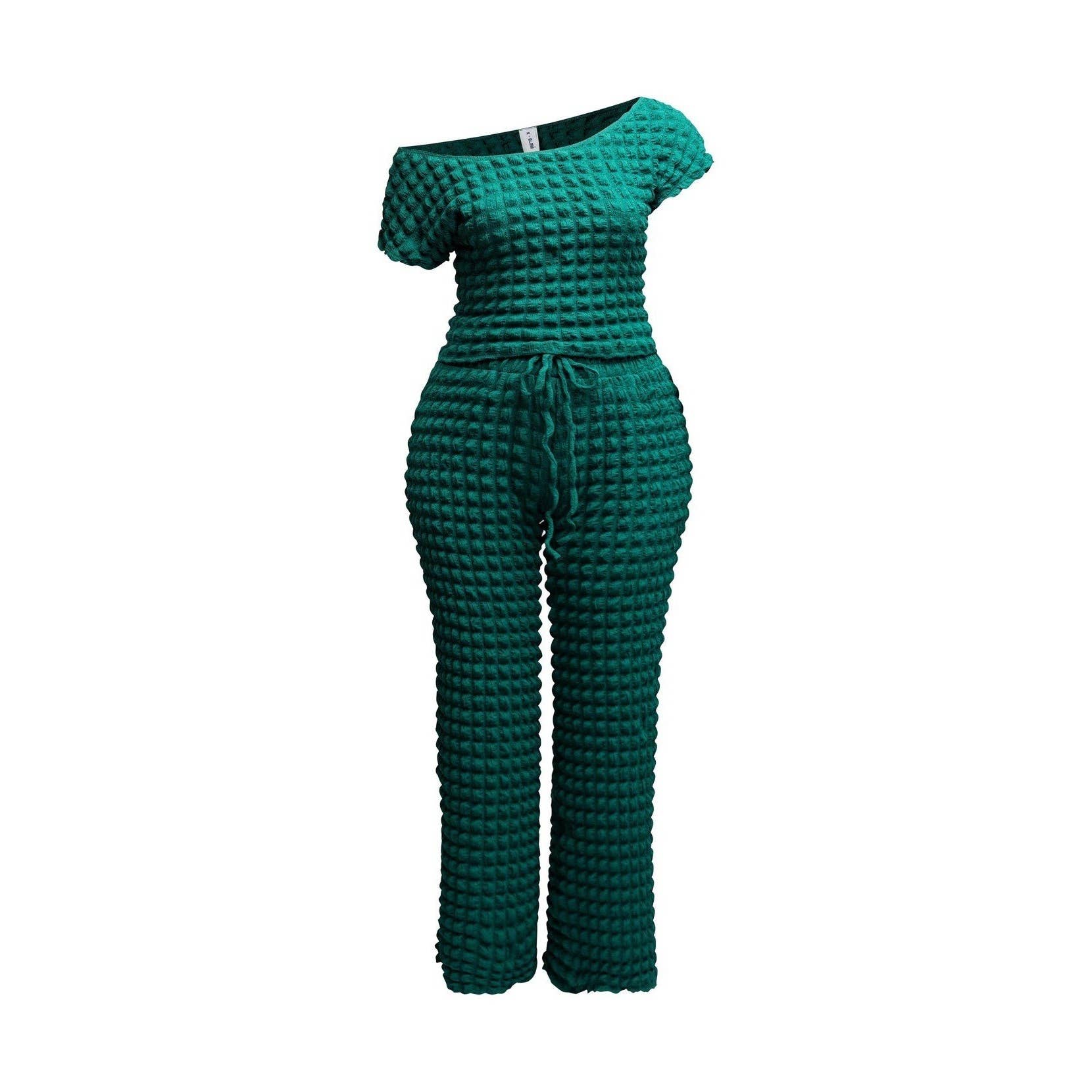 * Style No.: OS3349RN1 Bubble Texture 2pc Set, short sleeves crop Top and High Waist wide leg pants with pockets M,L,XL,1X,2X,3X POLYESTER 96% SPANDEX 4%