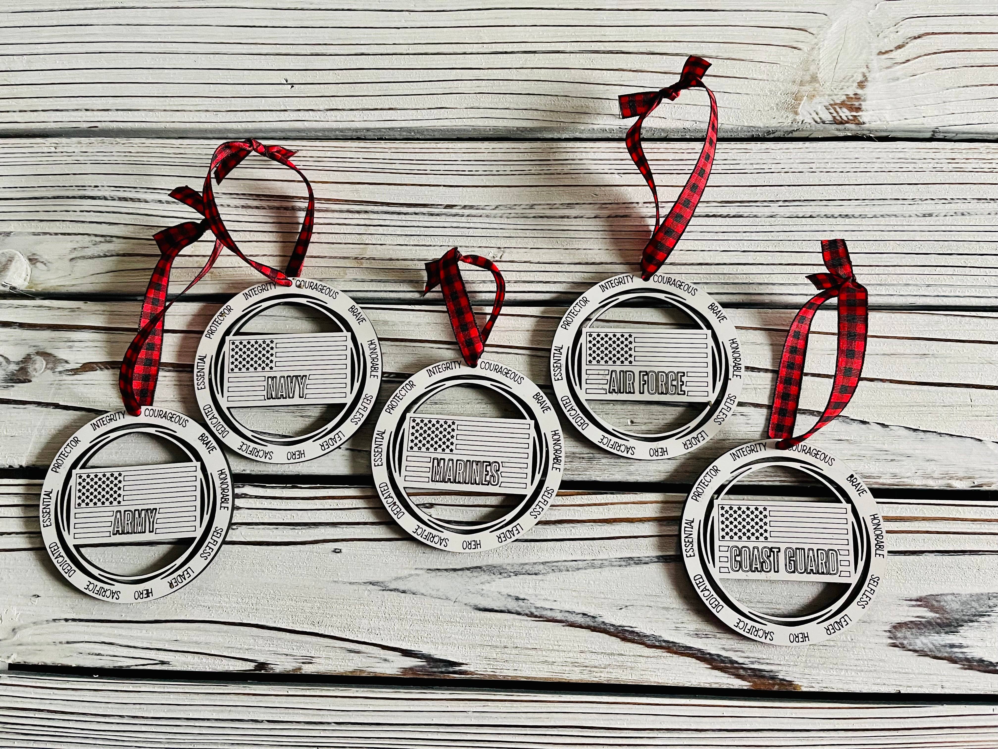 Laser Cut and engraved Veteran Ornament. Cut from 1/4" Birch. Comes assembled with jute twine for ready to hang ornaments. Measures 3.5" Diameter