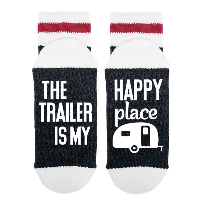 The Trailer Is - My Happy Place Lumberjack Socks Our funny lumberjack socks are made using high quality materials that will last for years. With the words placed on the bottom of these socks, they are perfect for putting your feet up and creating a good laugh. Instant purchase for any occasion. Men socks size 10-13 Polyester/cotton/spandex/vinyl Ribbed stretch with stripe accent Mid-calf height