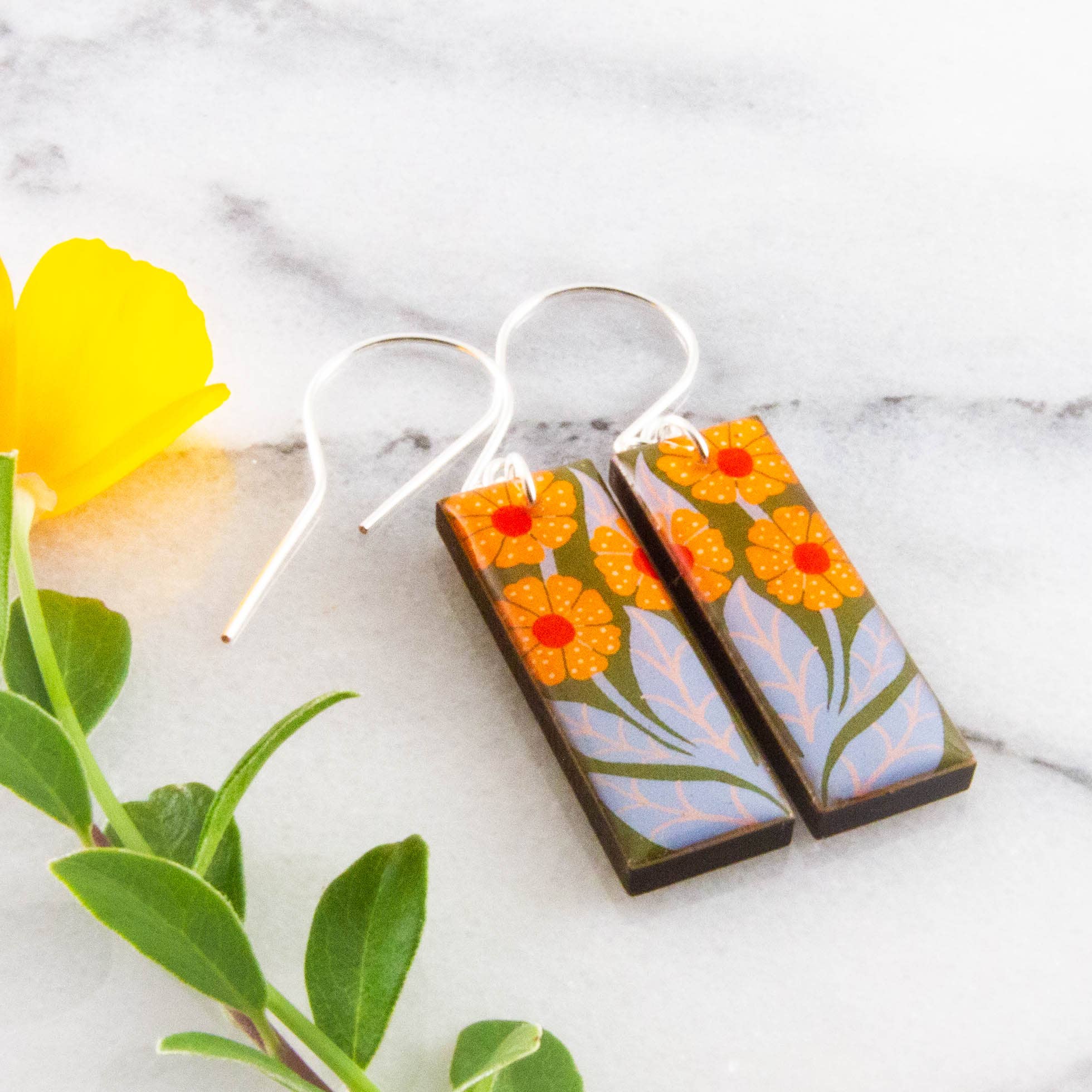 Charming vintage Japanese illustration, featuring a lucky tiger motif. Made from sustainably sourced North American hardwood, and finished with soy-based, BPA/VOC free resin. Approximately 2.25 inches long and .5 inch wide. Handcrafted, gold filled ear wires.