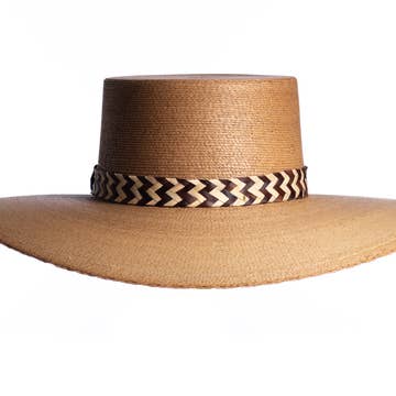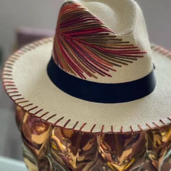 Natural Palm Hats Designed by Mexican Artisans Handmade, Handwoven Woven Attached (non removable) outer headband Inner Elastic headband, hand woven Embroidery design contained to outer brim as shown in photo, no embroidery design on the under belly of the brim