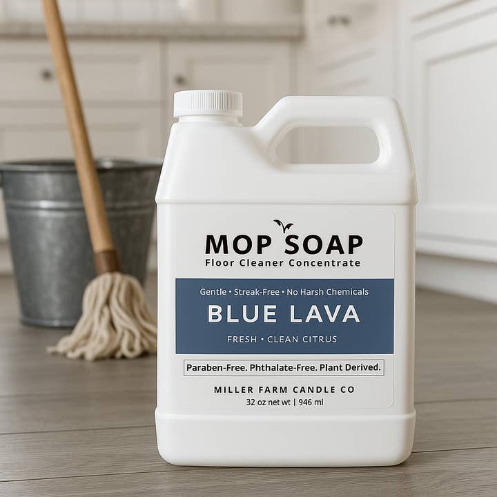 This listing is for a bundle of 1) 32 oz Mop Soap and 1) 4 oz Room + Linen Spray in the same scent. Elevate your shop’s cleaning lineup with our bestselling Mop Soap—an eco-conscious, highly scented floor cleaner your customers will love. Each 32 oz bottle is concentrated (just 2–4 tbsp per mop bucket), delivering over 30 uses and a streak-free, no-rinse clean. Works with any electric mop equipment that allows suds. Made with plant-based ingredients and clean fragrance, this mop soap doubles as self-care for the home. Add a quick burst of luxury to any space with our handmade Room + Linen Sprays—crafted in small batches using clean fragrances. Housed in a chic amber glass bottle, they’re perfect for freshening bathrooms, bedding, foyers, laundry rooms, and offices with just a few spritzes. Newly updated labels now complement our Mop Soap for cohesive branding on your shelves. Why Retailers Love It: ✔ Boutique-worthy packaging that sells on scent appeal alone ✔ Seasonal scent options for year-round repeat customers ✔ Clean, plant-based ingredients that meet rising consumer demand ✔ Pairs well with gift bundles, laundry goods, and refillable home items Safe for most sealed floors. Packaged in: 32 oz white HDPE bottle with modern label (scent-specific) Mop Soap MSRP: $18–$24, Room + Linen Spray MSRP: $12 | Min Order: 4 units per scent Adding a tester to this order will include 1) 2 oz mop soap sample. Scents currently available (updated for Spring 2026): Blue Lava Tropical fruits and bright citrus layered with clean green notes for a bold, energizing clean. Boujee Juicy fruits, soft florals, and warm amber create an effortlessly upscale, polished clean. Cashmere Creamy vanilla, soft sandalwood, and gentle musk for a warm, cozy, elevated clean. Fresh Linen Crisp cotton and clean ozone capture the fresh, sun-dried laundry scent everyone loves. Lemongrass Bright citrus and herbal notes deliver a fresh, energizing clean perfect for spring. Cowboy Bold citrus and sea salt blended with amber wood, cedar, and musk for a rugged, clean finish. Porchside Lemonade Juicy watermelon and zesty lemonade blend into a bright, refreshing spring clean. Amberwood Lavender Soft lavender balanced with rich amberwood and smooth musk for a calming, modern clean. Orange Grove Fresh mandarin orange with a hint of mild clove for a bright, lightly warmed citrus clean. Farmhouse Kitchen Crisp apple, fresh pine, and gentle spice create a cozy, clean country kitchen feel. Brazilian Glow Warm pistachio and almond layered over creamy sandalwood for a soft, sun-kissed clean. Minted Eucalyptus Cool eucalyptus and crisp spearmint deliver a fresh, spa-like clean.