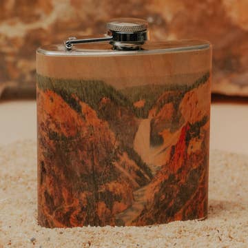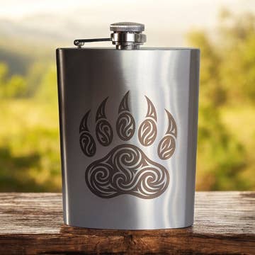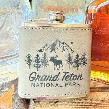 Leather Flask - Montana Our Leather Wrapped flasks are fun, functional, gift-able, and good looking. We wrap an 8 ounce stainless steel flask (your choice copper coated or matte silver) with a leather sleeve that's hand stitched on the back. The flask has a hinged top attached. The leather is earthy, a perfect match stamped with one of our stock designs or create a custom design.