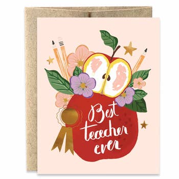 To thank all of the great teachers out there. Graphite penguin wearing a painted backpack and carrying a red apple text reads "Coolest Teacher Ever" Details: Size A2 (4 ¼" x 5 ½") Printed on soft white paper and paired with a Kraft envelope. Blank interior for personal message