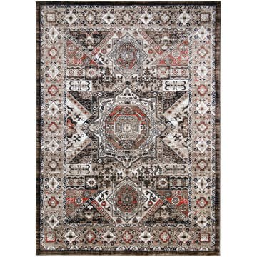 Artfully crafted in bold tones this area rug is a natural for a transitional or modern decorating style. Great for defining a seating area this elegant rug is classically styled for a rich look and feel in any room. Layer the look with similar colors from the rug in the rest of your decor such as pillows, window coverings, and accessories to create a designer worthy aesthetic. Perfect for a bedroom, dining room or family room this wonderful area rug is an easy way to update your design scheme.