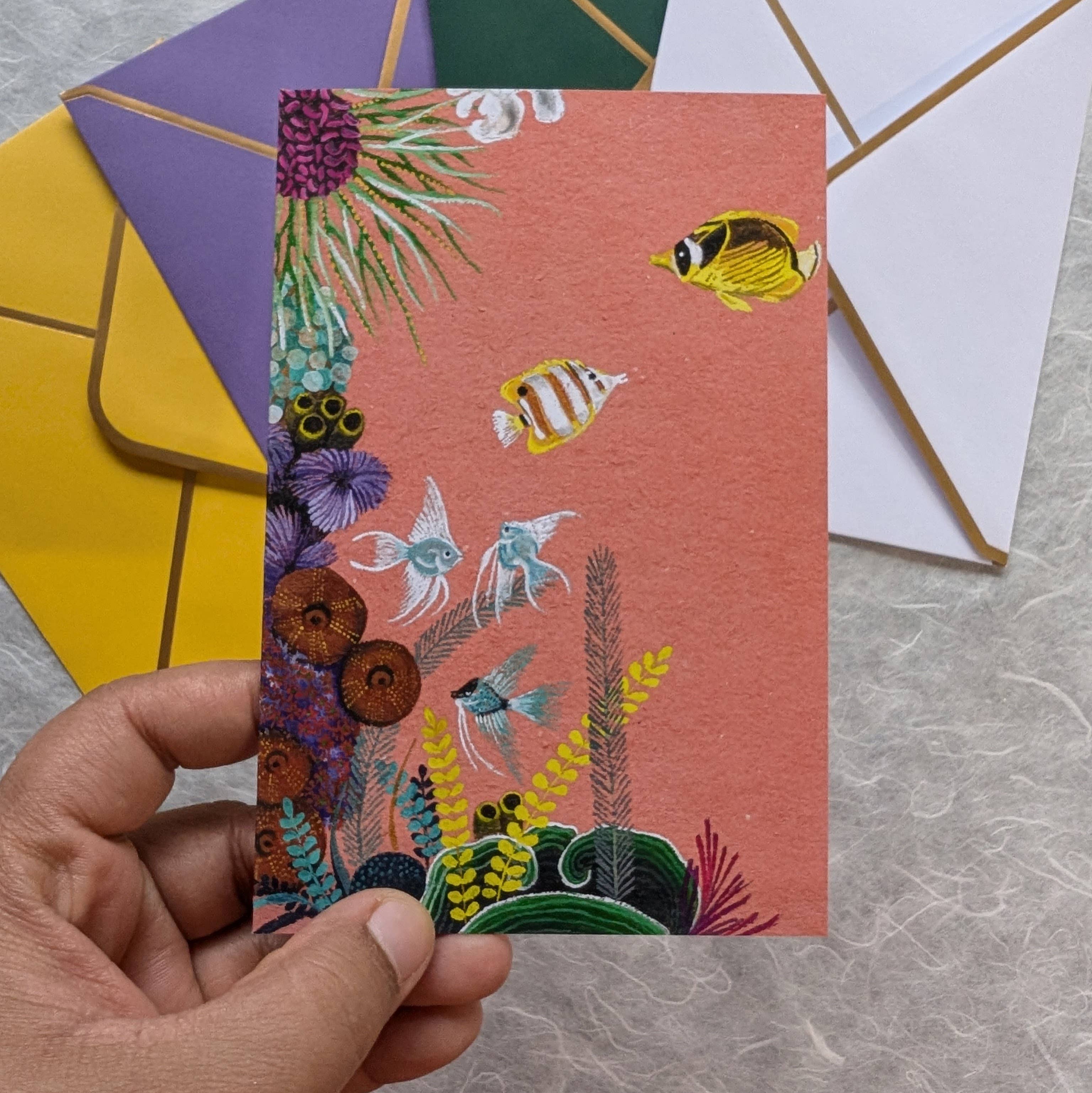 This is a reproduction of the original painting from the collection called '2 Degrees of Coral' that was done with gouache and embroidery. It has been printed on acid free, heavy 88lb. Polar Matte Paper using a professional fine art printer. This is a greeting card that is 4"x6" in size when folded and 8"x6" in size when opened. The inside of the card is left blank and is perfect for handwritten notes. There is an option of selecting your choice of envelope. All greeting cards come with a small info card that describes the artwork. Info card: 2 Degrees of Coral was a Kickstarter project and showcased 16 paintings which made one giant underwater view, with beautiful corals interconnecting through the borders of colorful handmade papers and gradually showed the phenomenon of coral bleaching towards the top of the view. A giant Octopus has opened one of his eye to look upon the colorful world of the corals while caressing them with love.