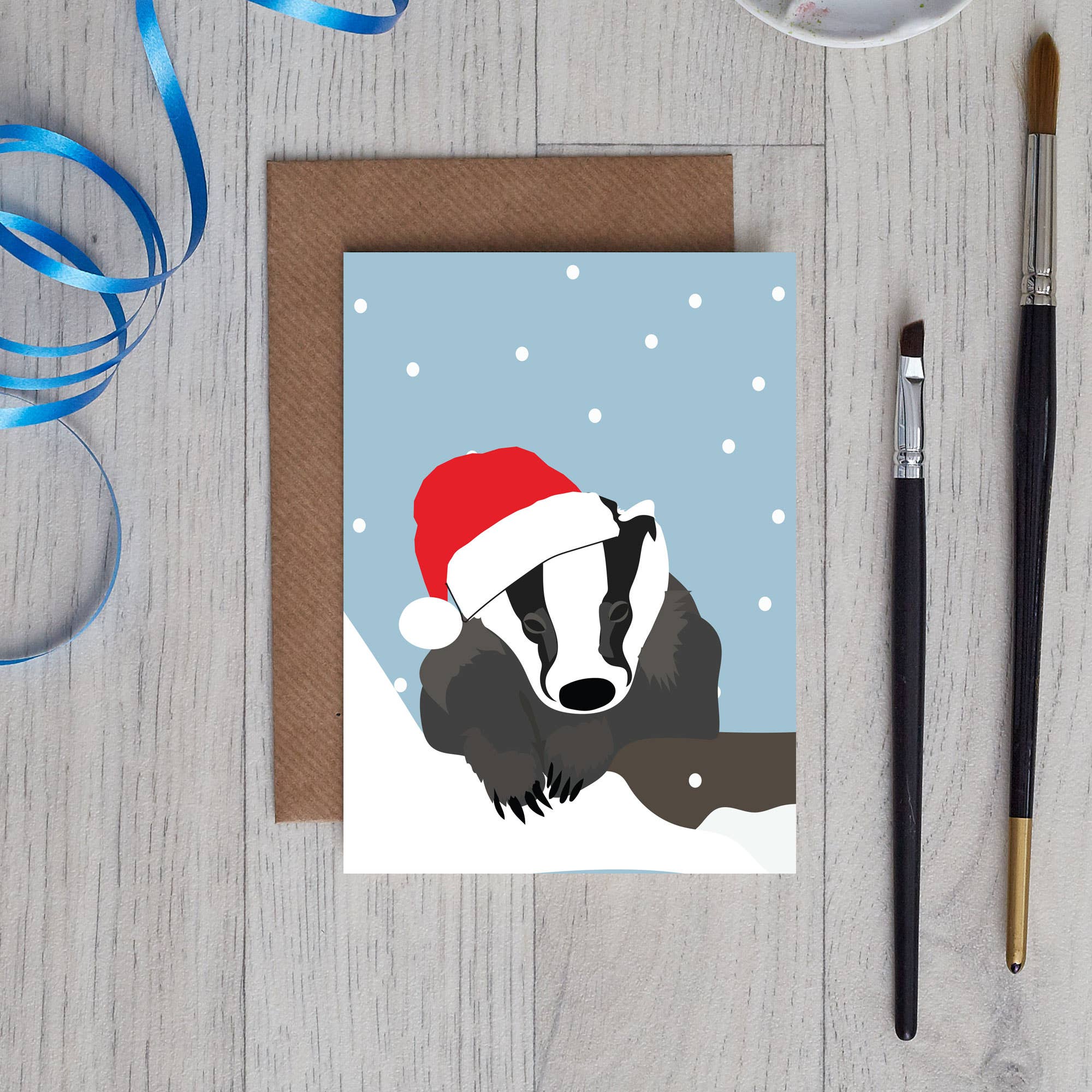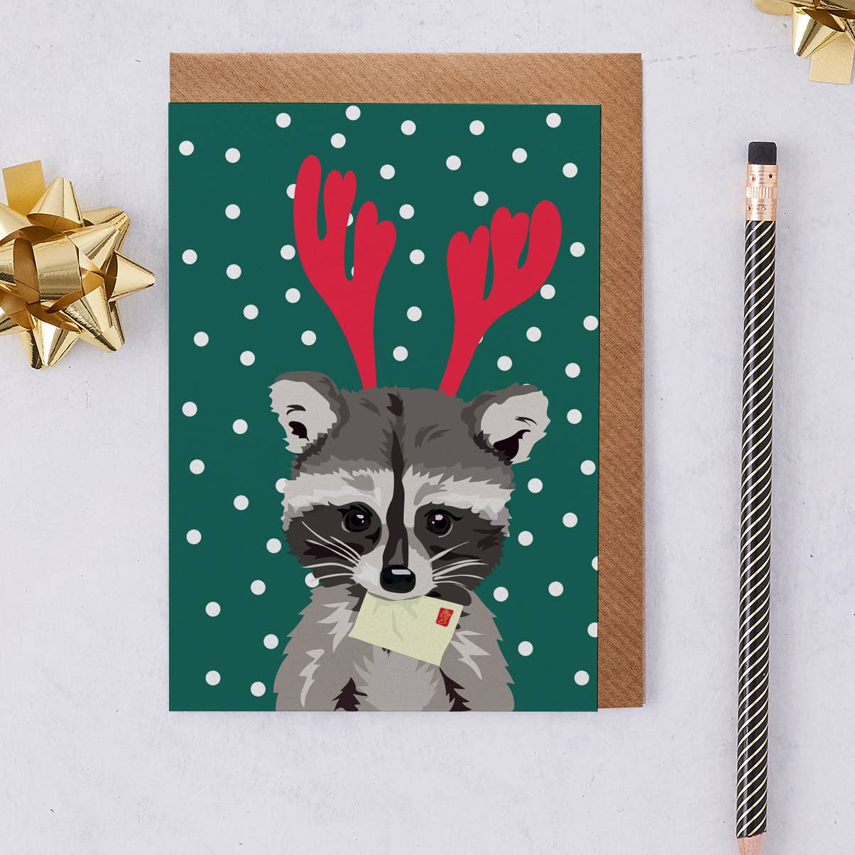 Christmas Fox Card sitting in the snow with mistletoe! We have a really cute woodland wrapping paper to match the card Our cards on printed in the UK on high quality FSC card using recycled paper envelopes. We can send the order plastic free, or they come with biodegradable potato starch cellos as standard.