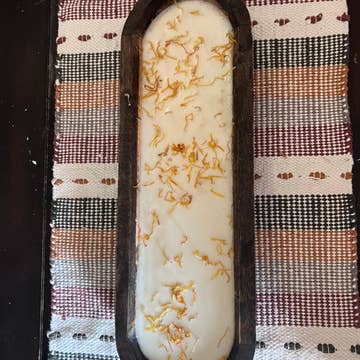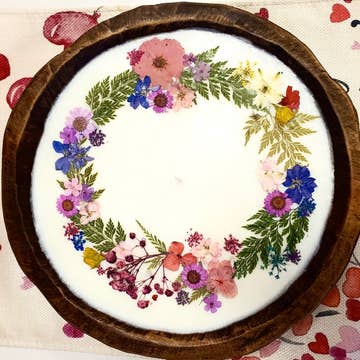 Our stained wooden dough bowls are made with soy and our strong signature fragrance. Each dough bowl is hand poured with soy wax and has 3 wooden wicks. Each bowl is hand carved and no bowl is the exact same, therefore, sizes are similar but not exact. Dough Bowls have pressed flowers. No two flower designs are the same and colors vary.