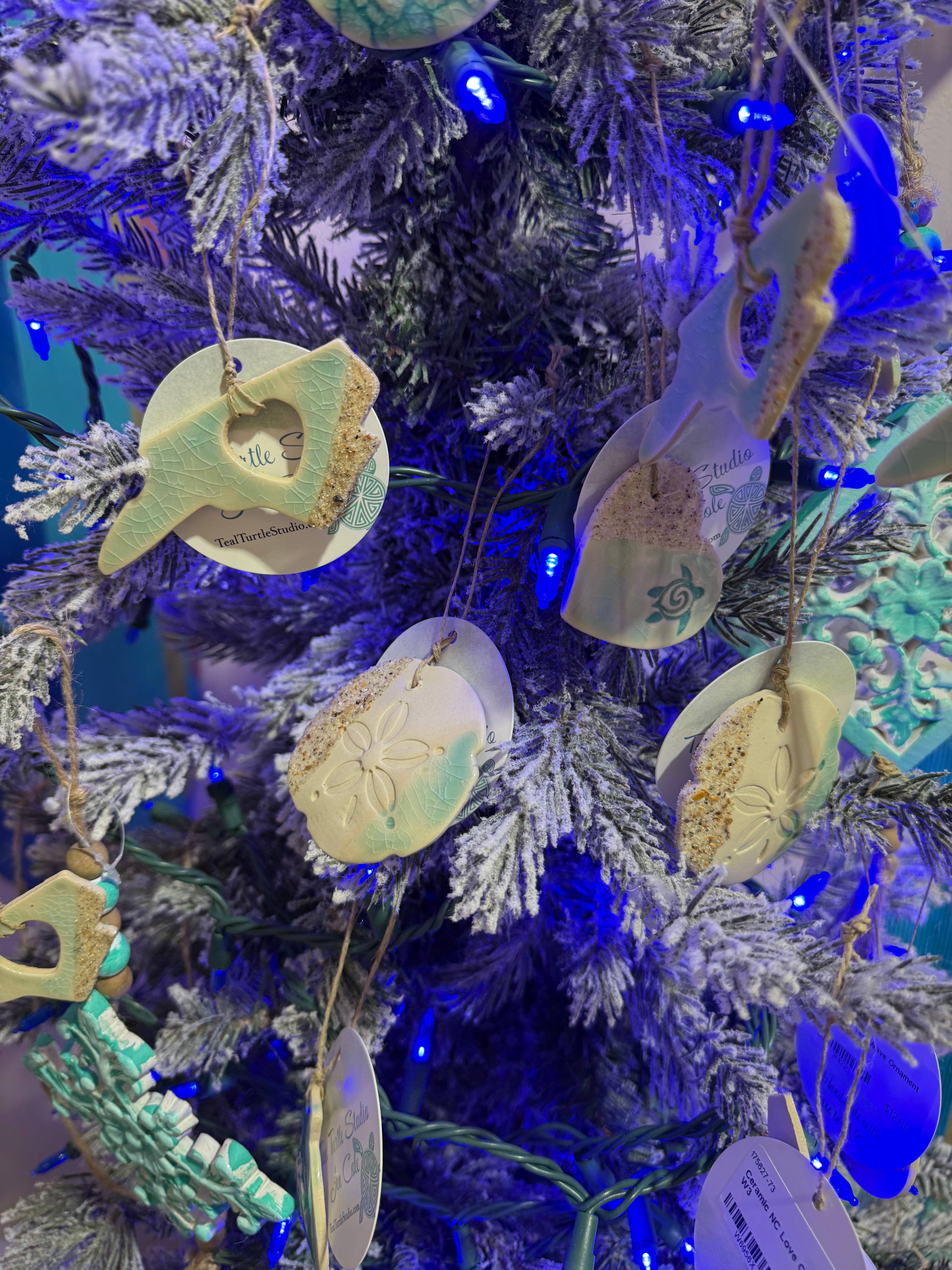 Handmade ceramic NC ornaments featuring a teal crackle glaze and a sandy coating. Lightweight and perfect for any coastal lover! Made in Wilmington, NC with all NC sourced clay. These ornaments sell wonderfully in beach stores, boutiques and coastal retailers.