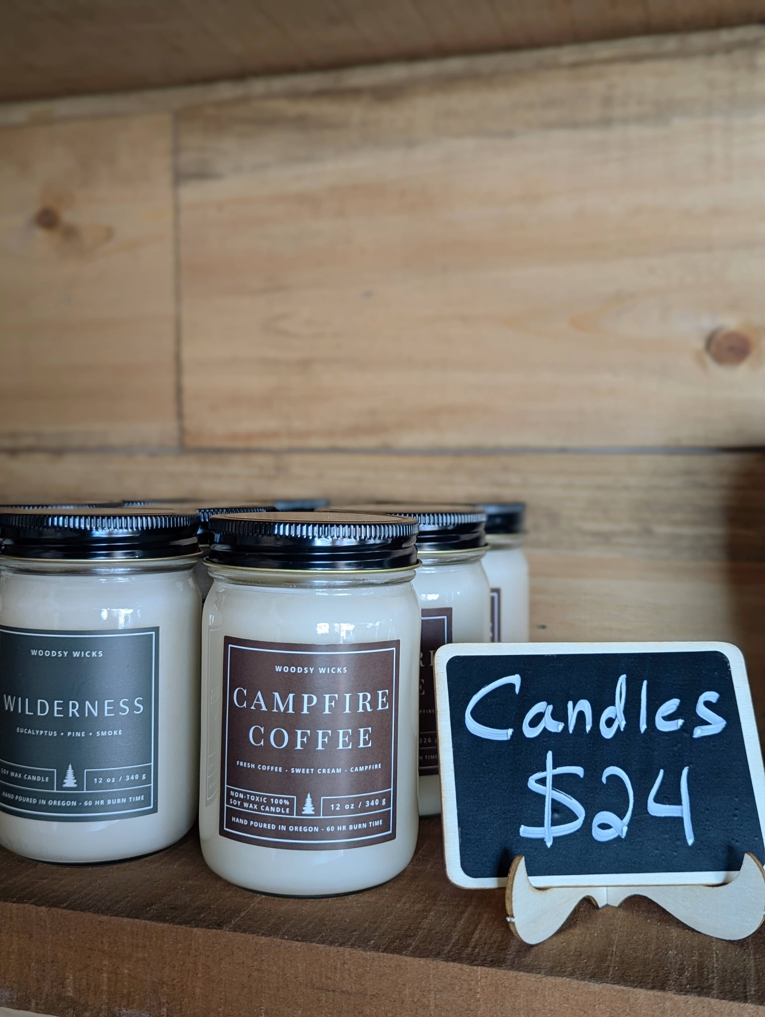 The delicious scent of fresh brewed coffee and sweet cream by the campfire! This scent is not overpowering or headache inducing Size- All candles in the wilderness collection are a substantial 12 oz and have a 60-hour burn time! Lead & Zinc free cotton wick OR All-natural untreated wood wick About our fragrances- All of our oils are a blend of essential and fragrance oils that are completely clean and non-toxic and meet the highest standards. About our wax- We use 100% soy wax with NO additives!