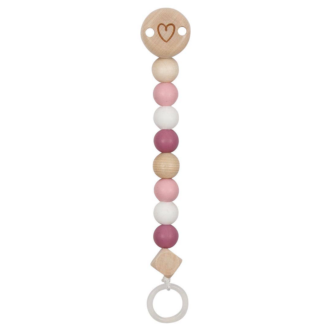 The Rosette Paci/Toy Clip is part of our Grande collection at 11.5 inches in length. Say goodbye to the days of constantly picking up a paci/toys off of the ground. Our clips are made with BPA free silicone and select styles also contain all natural beech wood to provide variant textures for baby teething needs. Our clips are designed to hold up to a sippy cup or snack cup. All beaded pacifier clips are assembled in our office in Houston, Texas but the materials are shipped from China.