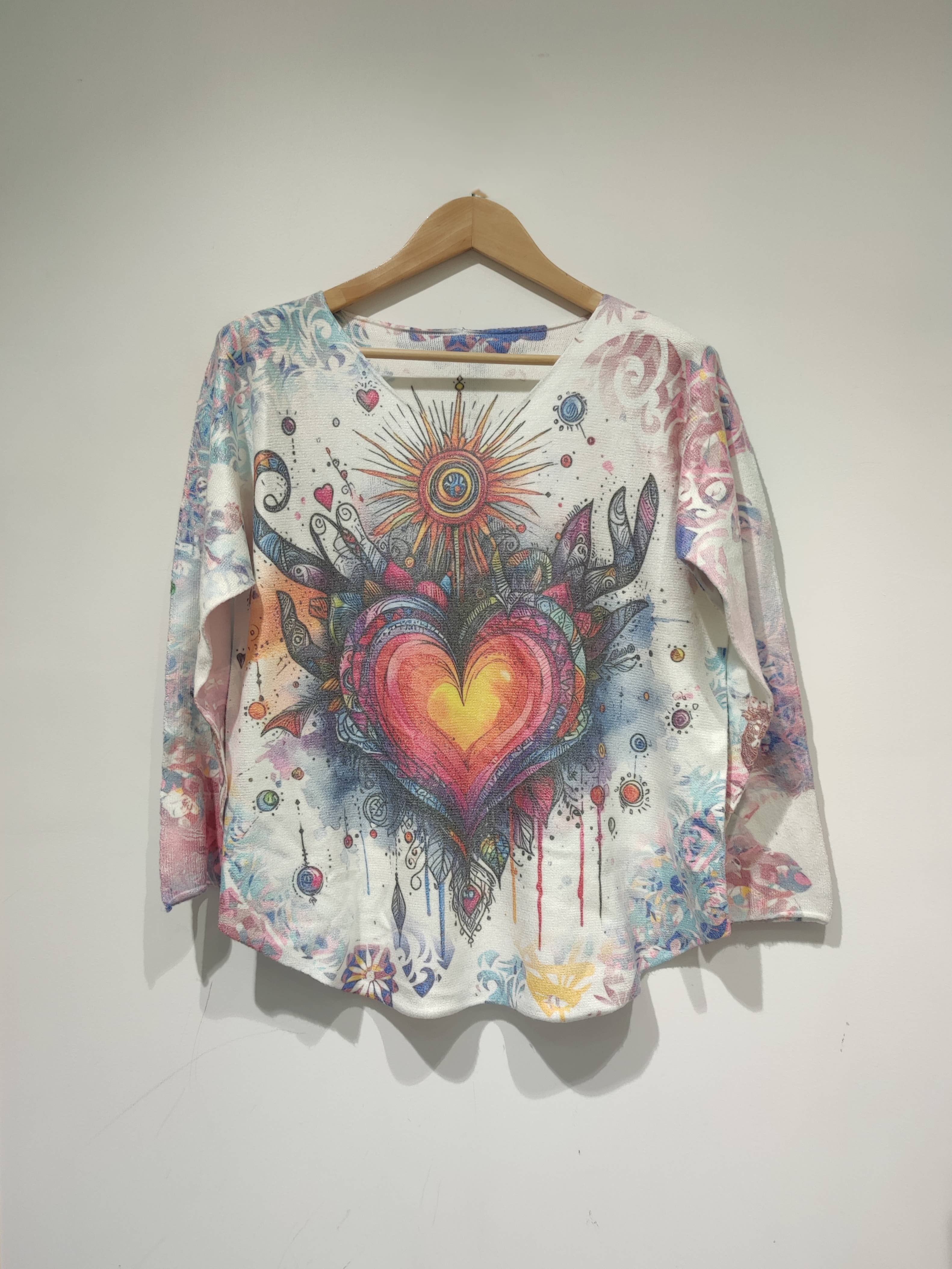 Printed lightweight knit sweater/Loose fit/open v-neck/ Long sleeves/Embroidered edges with silver lurex thread. Length: 65 centimeters/Maximum chest circumference: 140 centimeters. Can dress from size 42 to 52. COMPOSITION AND CARE TIPS Composition External 62% Polyester - 33% Viscose - 5% Elastane Interview We would like to support you and help you extend the life of your clothes, while reducing the environmental impact of washing. - MACHINE WASHABLE MAX.30ºC - BLEACH NOT ALLOWED - IRON MAX. 110ºC - DO NOT TUMBLE DRY - TETRACHLOROETHYLENE DRY CLEANING.