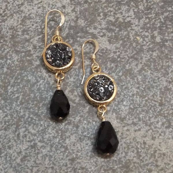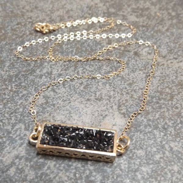 These necklaces are delicate and feminine! The focal is a 30mm x 10mm Druzy stone placed within a Gold Plated setting. The chain and clasp components are 14KT. Gold Fill. The feminine necklace is approximately 17" long.
