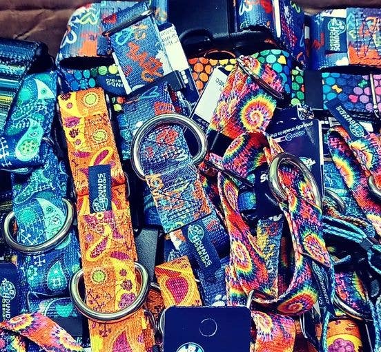 Recycle in Style!  New Earthstyle collection combines colorful upbeat designs with earth-friendly webbing made using recycled plastic bottles. Tons of great patterns to choose from, all available in your choice of Freedom Harness, any style collar, or any style leash.  You'll love these designs that are more earth-friendly and the retro-hip designs of the EarthStyle line. It comes in two widths: 5/8” for smaller dogs under 40 lbs 1” for larger dogs over 40 lbs Proudly made in the USA!