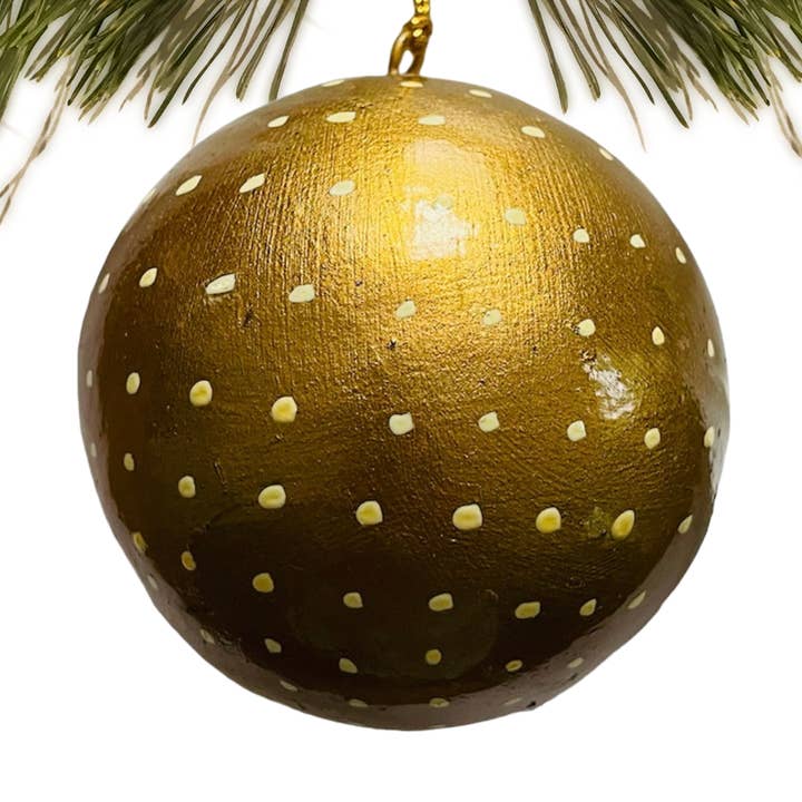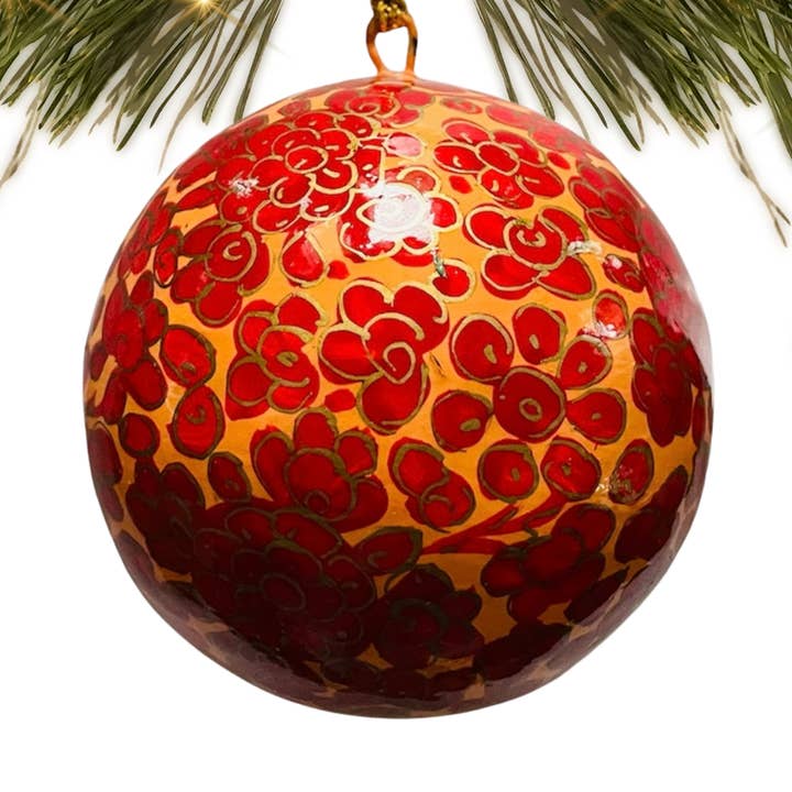 Paper Mache Christmas Ornaments are handmade by an artisan in Kashmir, India, using paper mache crafting techniques that are generations old. The 3-inch ornaments are fully hand painted and topped off with hanging loops. Each ornament comes with a string and display tag. These are handmade items so each one is similar but not exact. Approximate 3” circle