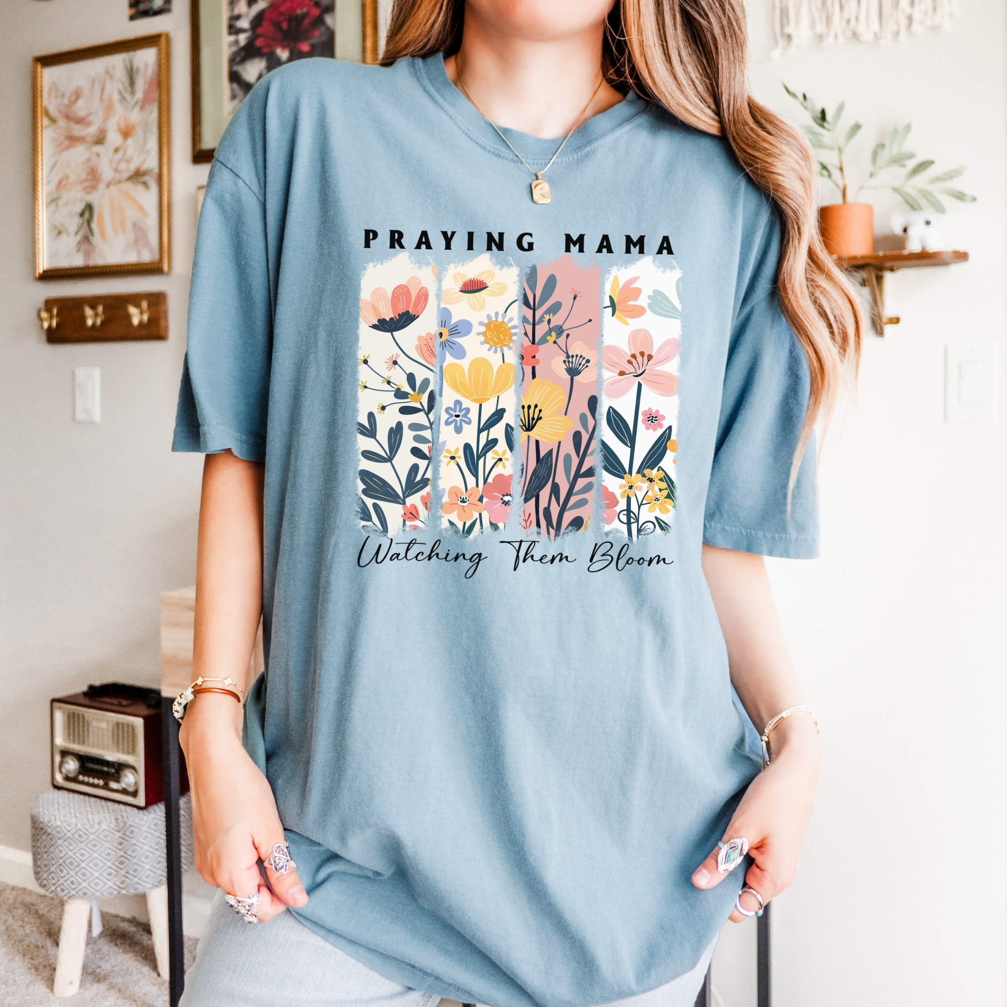 This Comfort Colors t-shirt features a beautiful faith-based graphic inspired by Proverbs 31:28. The front showcases a vibrant floral arrangement with colorful flowers and greenery, creating a warm and uplifting aesthetic. The text reads, "Her children will arise up and call her blessed", emphasizing a message of gratitude and love for mothers. The bold yet elegant typography in shades of pink or white complements the floral artwork, making this tee a perfect gift for moms or a stylish way to express faith and appreciation. This design is pressed in our print shop in Kentucky. Comfort Colors 1717, Christian tshirts, faith tees, faith apparel, modest womens clothing, modest outfit inspo, church outfits, faith based clothing, faith based shirt, bible verse tee, scripture tee, Christian apparel, gospel shirt, boutique graphic tees, vintage style tee, botanical, distressed, Mother's Day Gifts For Mom, Mama Shirt, Mom Shirt, wildflowers, floral,