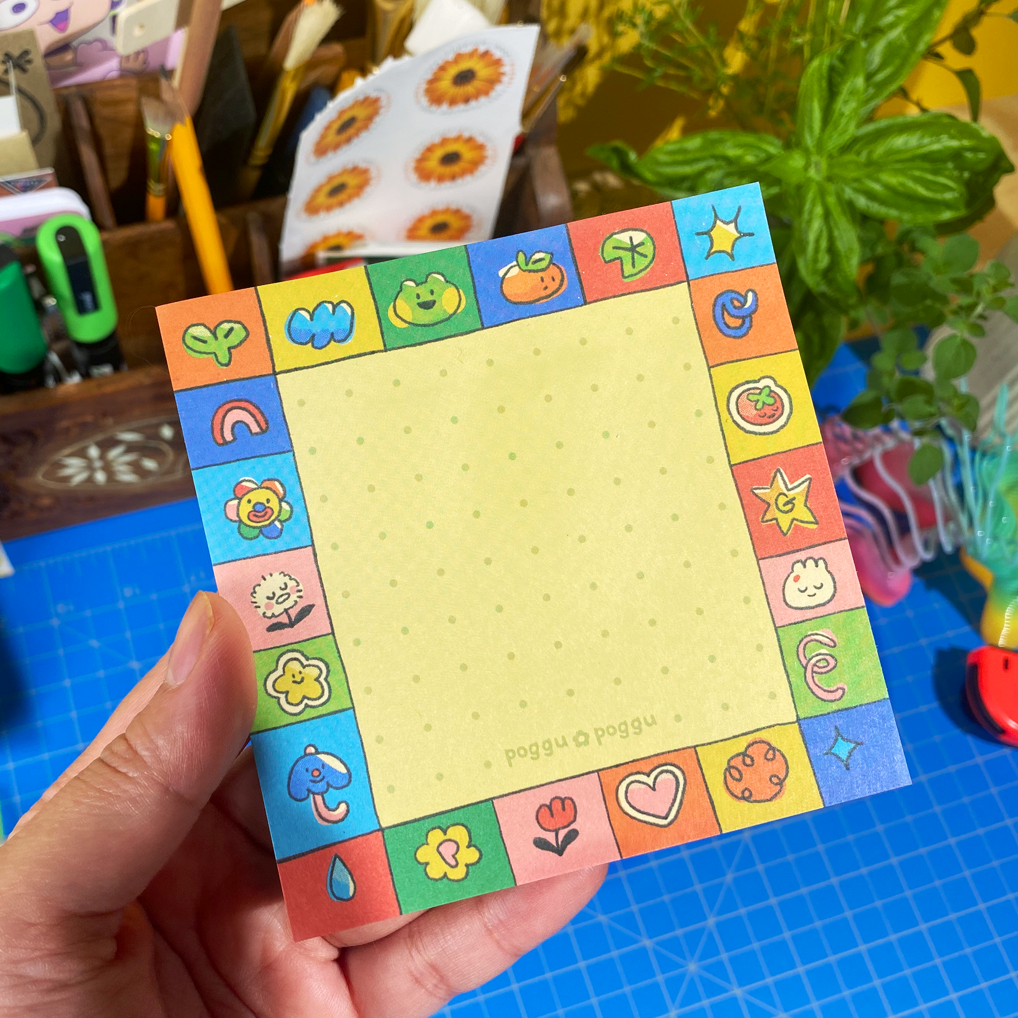 Explore the world of Puddle Town with a silly little froggu named Poggu. Color whimsical scenes of dancing frogs on flowers and fruits. A mix of simple pages to more complex pages. Illustration of rainbows, silly frogs, strawberries, and lilypads. Art and illustrations by Poggy • 22 illustrations • Size: 8” x 10” • Paper back coloring book. • Design and illustrated by one tiny frog 🌱🐸