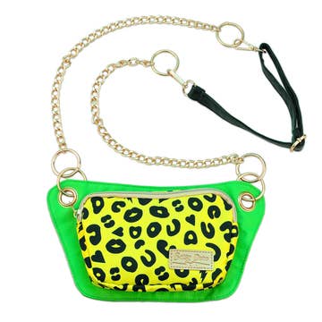 This so-retro-it's-now fanny pack features a rhapsody of rainbow colors in an early 90's-inspired print. The classic style poly nylon pouch has two zipper pockets and a black poly webbing waist belt that adjusts from a minimum of 30 to a maximum of 44 inches. The pouch is 10 inches wide by 6 inches tall and can be worn at the waist, across the hips, or as a crossbody bag. * Retro rainbow print. * Red zippers with silver tone pulls. * Black waist belt adjusts to fit 30 to 44 inches and has black plastic adjusters and buckle. * Bag is 10 inches wide by 6 inches tall and 2.5 inches deep. * The back pocket is large enough to hold just about any phone, plus keys, compact, sunglasses and more. * The front pocket is a little small for most phones but is great for smaller items like lipsticks, pens, hairpins, and cash. The bag looks best with slimmer items in the front pocket and bulkier items in the back.