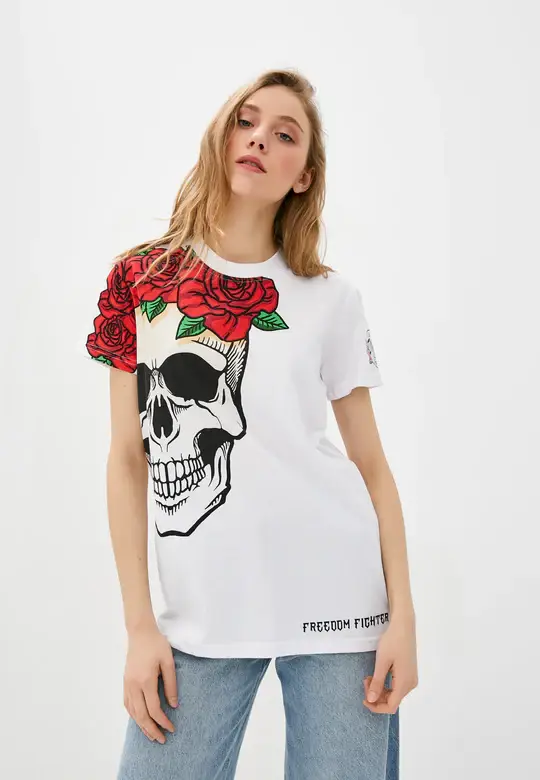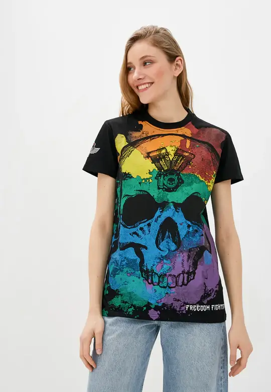 "DASTI Black T-shirt for Women with Colored Skull and Palm Trees. Wear your spirit front and center on this graphic tee. Its loose fit and lightweight cotton will keep you comfortable all day. These DASTI trendy cotton T-shirts for women with Rib-knit necklines have a Regular and Relaxed Fit. Skull, Rock-n-Roll, and Goth lovers and fans celebrate your passion with Cotton Graphic Skull Fit Tee. Cut from a soft, easy-wearing cotton jersey, this women's short-sleeve T-shirt has its original graphics. The rich graphics color pops off the white background in this cute t-shirt. Materials: 60% organic cotton, 40% polyester. Make Vibrations    Skull, Rock-n-Roll and Goth lover and fans celebrate your passion with Cotton Graphic Skull Fit Tee. Cut from soft, easy-wearing cotton jersey, this unisex short-sleeve T-shirt features oversized graphics of a Skull. The rich color of graphics really pops off the white background in this cute t shirt for women."
