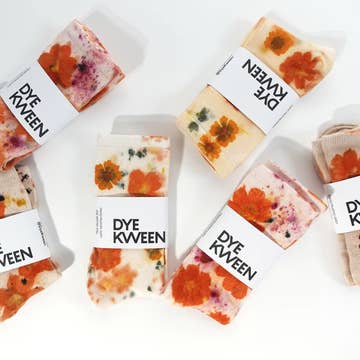 "Garden Flowers Imprinted on Your Feet! Flower Power Bamboo Socks. These are the softest socks you will ever feel. Made from sustainable bamboo rayon, bundled dyed with sunburst coreopsis, marigold flowers, and other homegrown botanicals. Size: adult one-size (fit most feet up to 10 women) **Each item is a one-of-a-kind and handmade. The actual item will vary from photograph** Imperfections and variations are part of the process and make these pieces unique. Care: Wash delicate on cold water setting with a ph-neutral detergent (eg. no Tide or Gain). Hand dry or tumble dry low."
