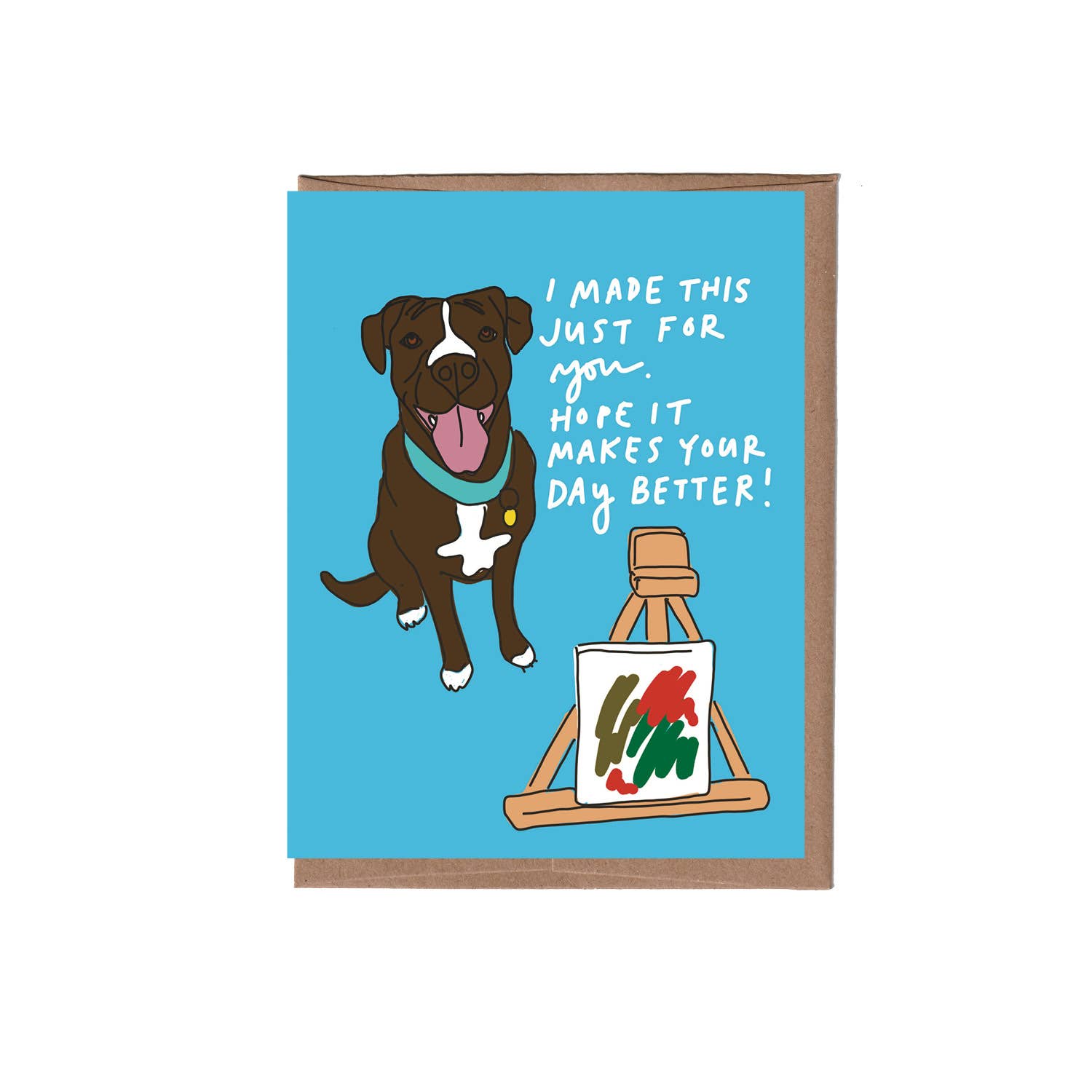 Our dog, Stickers, has traveled from rural Kentucky to an animal shelter in Chicago to the La Familia Green studios. Now she plays, goes on walks, chews bones, and poses for cards. All dogs should have it so good. Flat printed on FSC certified paper from an original handcut collage, drawing, or print Box of six 4.25" x 5.5" folded cards with recycled kraft envelopes Blank inside Made in USA