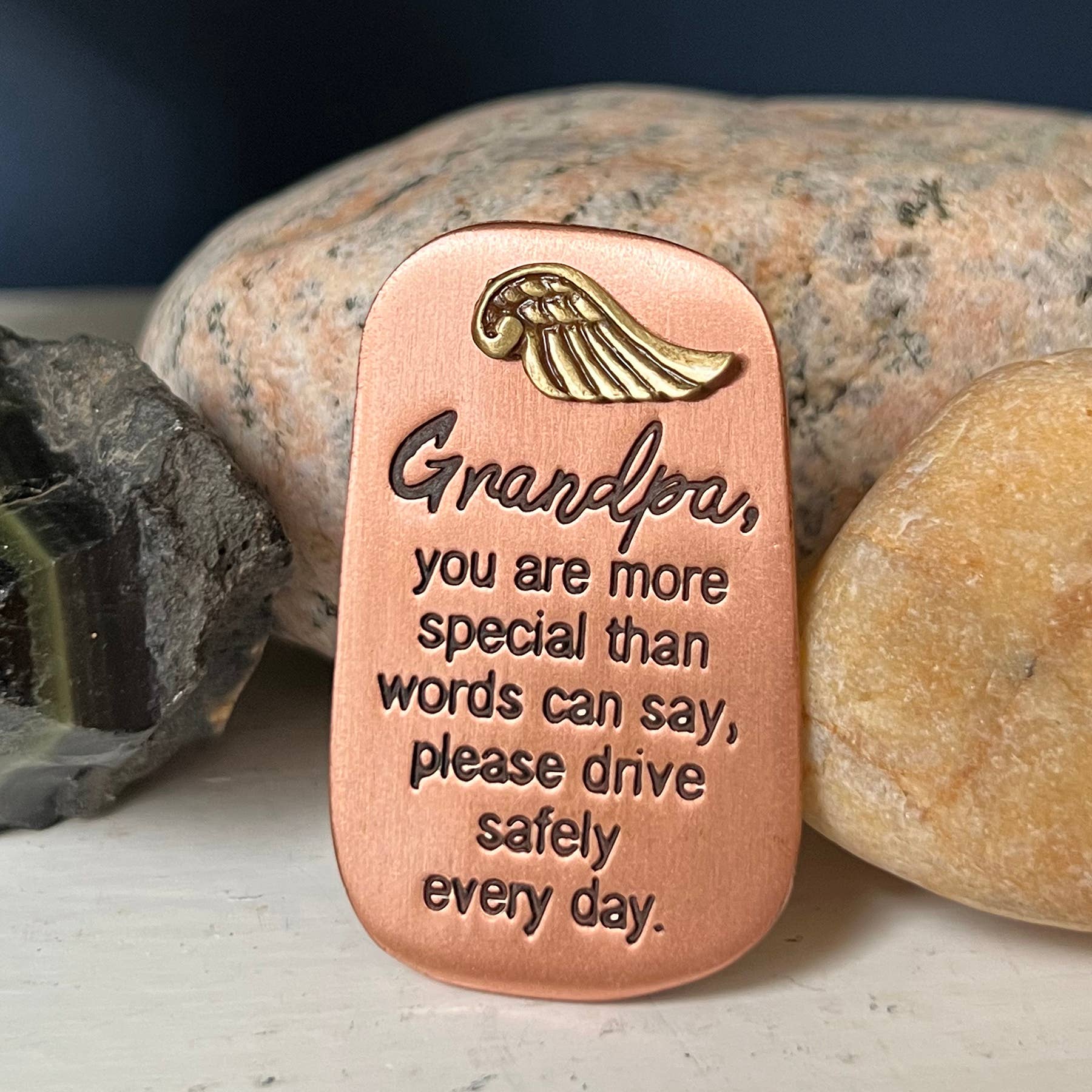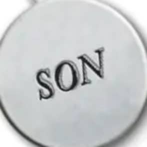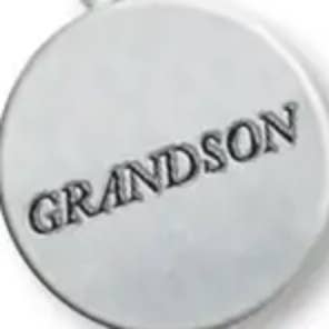 Cast metal dog tag shape with hematite ring and chain, wood bead, and metal charm, finished in silver, gold, or copper enamel. Tag is 1¼” W × 2" H. Overall length is 1¼"W x 4 ⅜” H. Poly bagged.