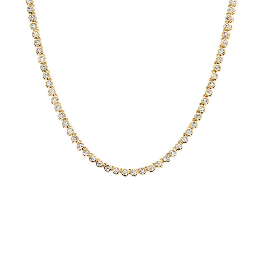 Our bestselling choker style, with graduated stones that loop all the way around for serious shine. Available in 14kt gold plated brass or Rhodium plated brass Necklace measures 16" Box clasp with safety latch Product Care: Metal: Use a soft cloth to gently wipe clean, then remove any remaining impurities with mild diluted soap. Rinse with warm water and dry thoroughly before storing in the provided jewelry pouch. Do not use abrasive cleaners, steamers or ultrasonic machines. Gemstone: Avoid contact with perfumes, hairsprays or other chemicals. Clean with a moistened cloth. Do not use chemical jewelry cleaners.