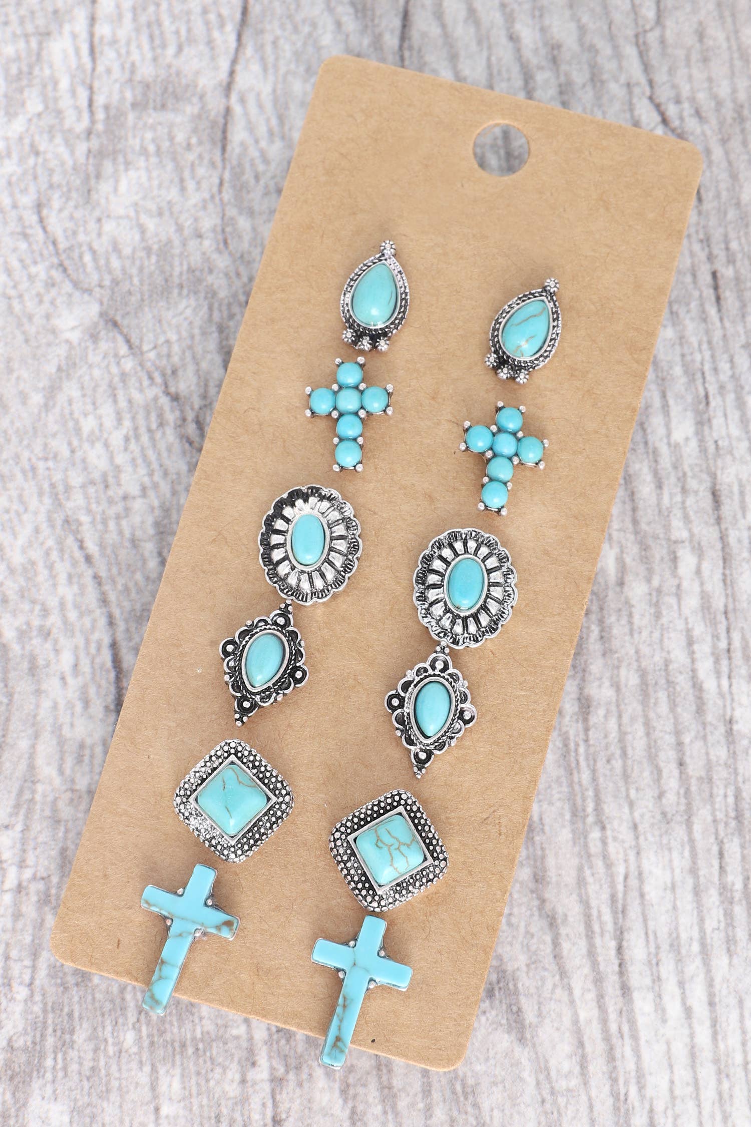 6-PAIR ASSORTED WESTERN THEMED STUD & HOOP TURQUOISE SEMI STONE EARRINGS SET IN OXIDIZED SILVER TONE METAL CROSS SET E1 0.5X0.5 E2 0.45X0.45 E3 0.5X0.5 E4 0.5X 0.35 E5 0.45X 0.45 E6 1X 0.5 CONCHO SET E1 0.5X0.45 E2 0.5X0.45 E3 0.4X 0.4 E4 0.4X 0.4 E5 0.5 X 0.5 E6 1.12 X 0.5 SCALLOPED CROSS HALF OPEN HOOP AZTEC CONCHO THUNDERBIRD TURQUOISE COWGIRL STATEMENT SOUTHWESTERN COWBOY RODEO BOHO BOHEMIAN NAVAJO NATIVE AMERICAN SOUTHERN COUNTRY WESTERN HOOPS