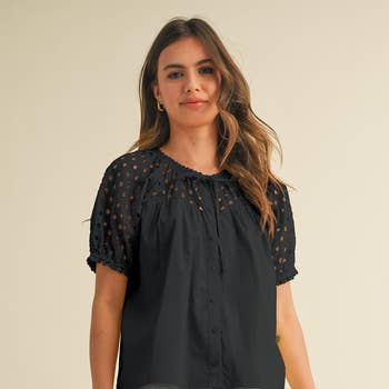 MR9004 1 XS 2 SMALL 2 MEDIUM 1 LARGE V NECKLINE LONG SLEEVES FRONT TIE DETAIL RUFFLE DETAIL SPLIT HEM SHEER PATTERN POLKA DOT PRINT WOVEN TOP FRONT LINED SHELL:100%POLYESTER LINING:100%POLYESTER