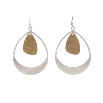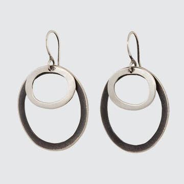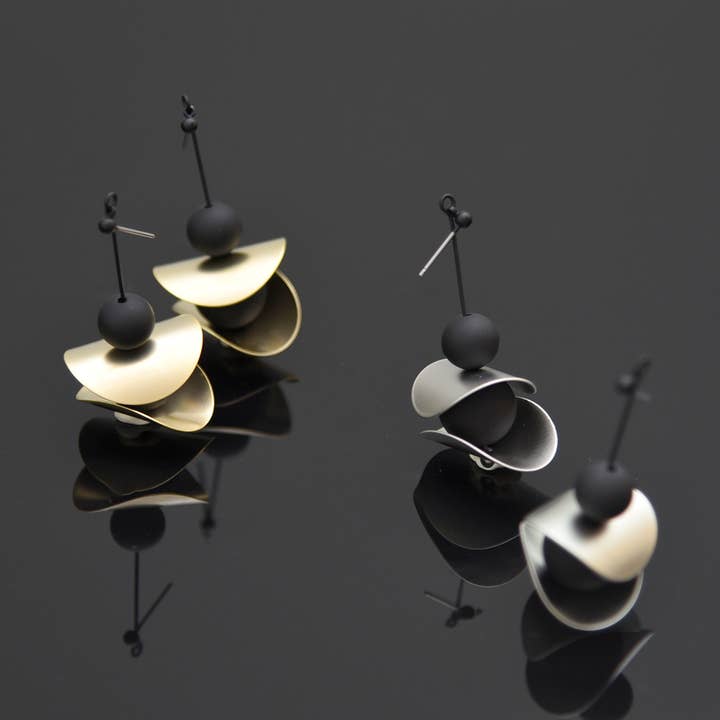 Each concentric circle of these minimal earrings spins gently around the centre post, creating a dynamic and stylish design. Materials All metals are brass finished with plating (see below) Finishing 12K Gold, Rhodium, *Black Zinc on brass (*Nickel Free) Dimensions Each earring measures 2" x 1 5/8" overall.