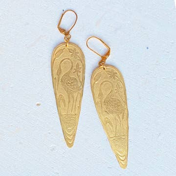 These delightful illustrated crane earrings are an ideal gift for anyone who loves the outdoors. Made from sustainably sourced North American hardwood and finished with soy-based, BPA/VOC free resin, these vibrant earrings will bring joy and brightness to any wardrobe. Handcrafted gold fill ear wires. Approximately 2.25 inches long.