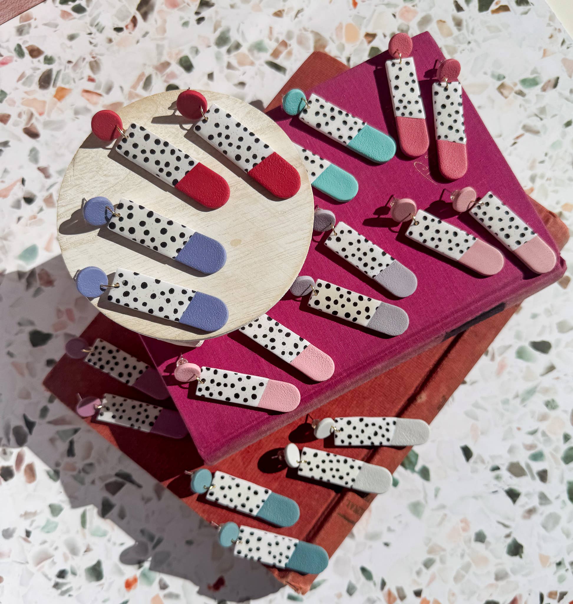 These statement dangles are where elegance meets play. Each pair begins with a mesmerizing white and black marble base—fluid, organic, and one-of-a-kind—artfully speckled with delicate touches of gold leaf that shimmer with every turn. Layered atop are textured charms in a kaleidoscope of vibrant colors, adding a joyful pop of personality and reflecting the beautiful diversity of color preferences that inspire my work. Every detail is thoughtfully crafted: from the smooth polymer clay and glossy resin finish that make them lightweight and easy to wear, to the 18K gold-plated findings chosen for comfort and shine—even for sensitive ears. They strike that perfect balance between bold and delicate, making them just as fitting for everyday moments as for special occasions. Each pair is a little piece of art for your ears—vibrant, versatile, and joyfully handmade to make you feel like you.