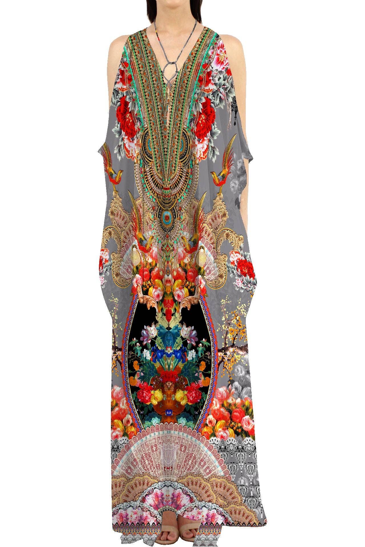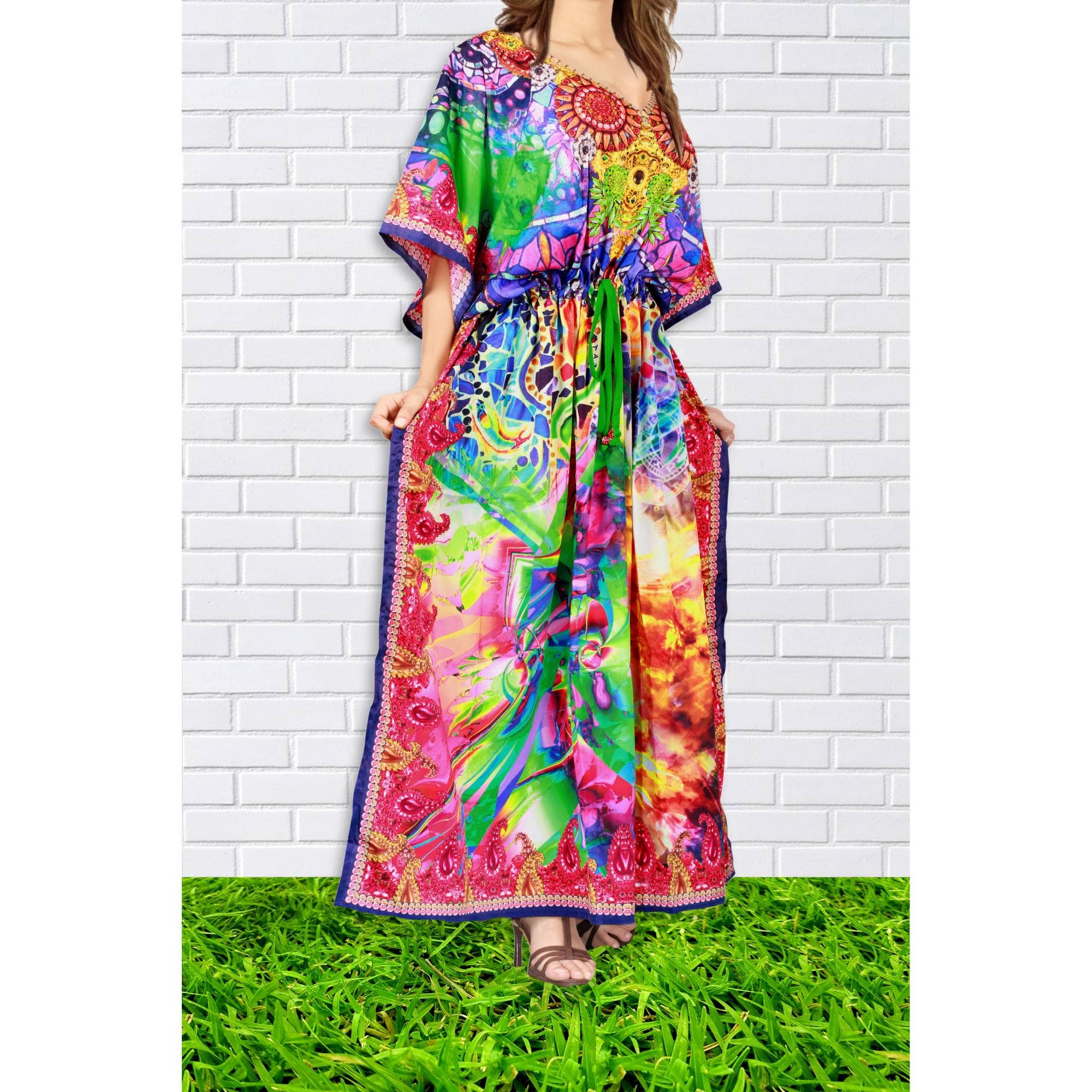 Description Print Kaftan Dress, Women Long Caftan Dress, Beach Cover Up, Flower Hand Block Print Sleepwear Maxi Dress, Loungewear Measurements :- Size - Free Size Size - One size will fit sizes S to XL Length - 51 Inch Fabric - 100% Cotton Kaftan Has Adjustable Drawstring Waist To Loose Or Tight , Kaftan Has V Shape Neck Which Is 8" Inches Deep. Kaftan Is Multi-Purpose And Can Be Worn As A Cover Up At The Beach ,Lounge Wear ,Sleepwear ,Pregnant Women Hospital Gown For Newly Moms ,Maxi Dress ,Free Dress Etc . Indian Kaftan Very Comfortable To Wear In Both Hot Or Cold Weather. Kaftan Is Super Comfortable .It Will Be Loose And Free Flowing And Fabric Is Very Soft With Vibrant Color