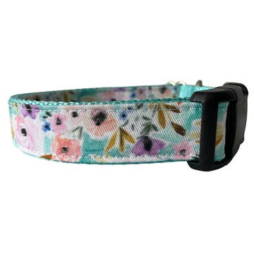The Aldeen Bow Tie Dog Collar will brighten your day with it's scrolling green garden design. Beautiful flowers dance across the collar and bow tie. The bow tie is removable with two hook and loop fastener strips. The bow tie has an interfacing center to retain it's shape. This collar is the perfect fit for any stylish, trendy pup.