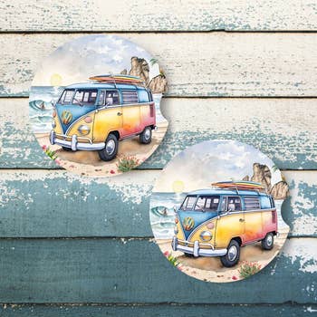 Protect your surfaces in style and add a splash of coastal flair with this ceramic coaster that features a surfing design with a van on the beach at sunset.