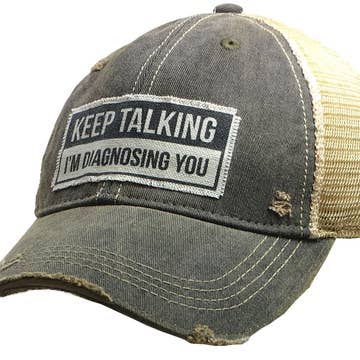 Vintage distressed trucker cap "Keep Talking I'm Diagnosing You" Color: Black distressed Material: cotton/polyester blend, mesh back. Size: one size fits most, with an adjustable snap back strap. Unisex cap.