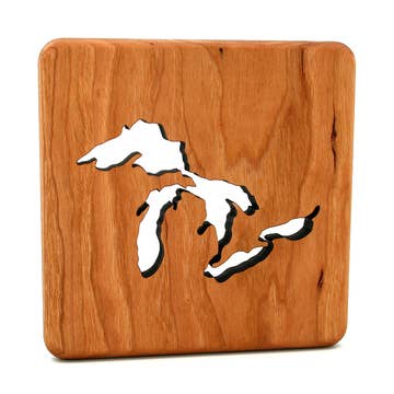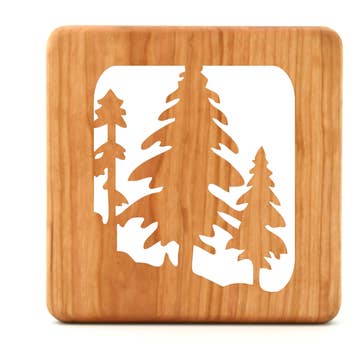 Custom wood trivets available in multiple designs. Made from Solid 5/8" thick Cherry Wood. Our unique designs are laser cut featuring your graphic of choice. Not only do these trivets add functionality to your kitchen, they also make great gifts too. Each trivet is hand sanded and hand dipped in a natural oil finish preserving the natural beauty and luster of Cherry wood grain. Approx: 6" square x .625" depth Receive a 5 place display rack with the purchase of 16 trivets.