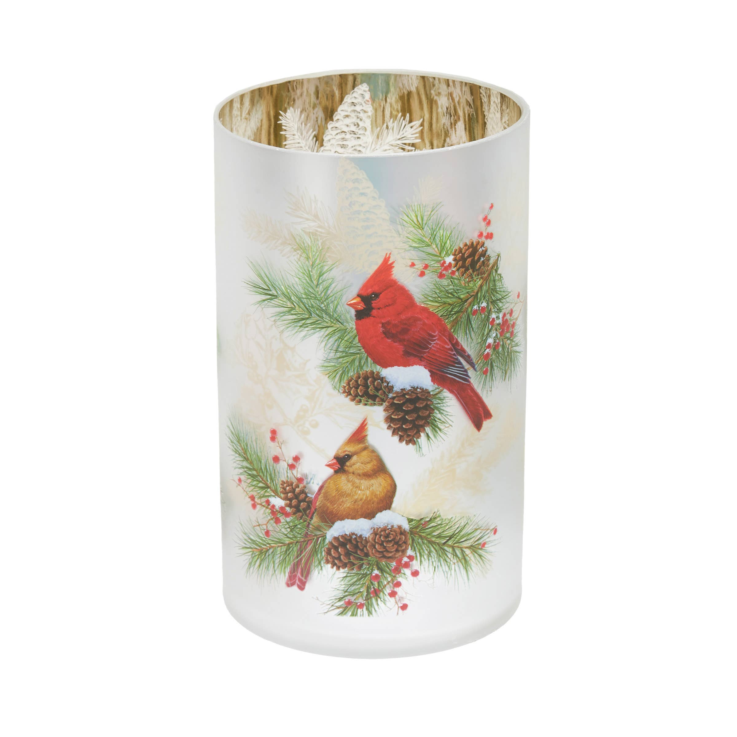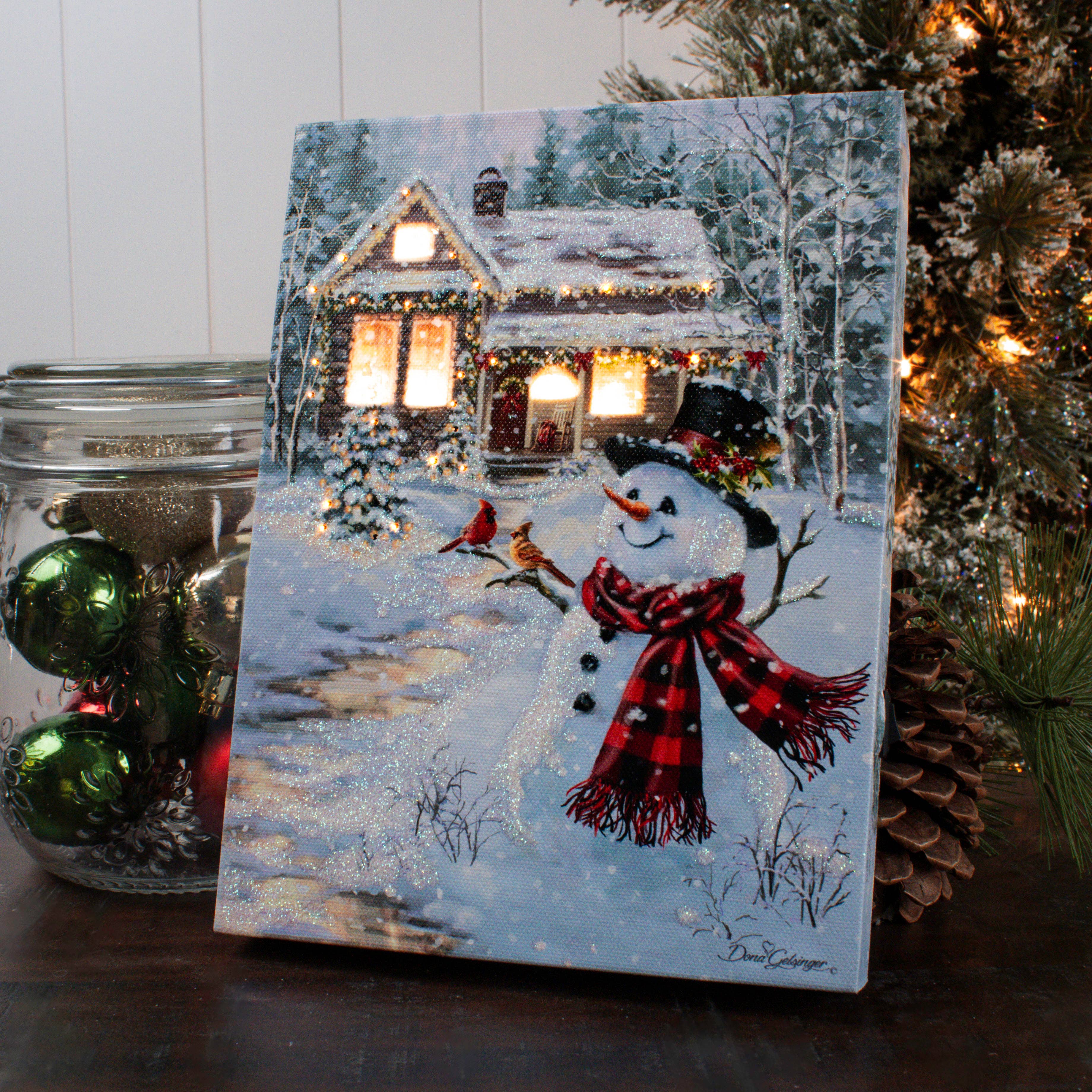 * Artwork by Dona Gelsinger. * 8" x 6" * Easel Back * Fiber Optic/LED Technology * Auto Timer: On 6 HRS, Off 18 HRS. * Operates using AA batteries or a USB-C cable (neither are included). * Made in China About the Art: Celebrate the season of love with our Together for Christmas 8x6 Lighted Tabletop Canvas. This exquisite piece captures the magic of the holidays with two adorable cardinals perched in front of a snow-covered window. One sits on a branch while the other rests on a garland, both gazing at the warm and inviting glow emanating from the candles on the other side of the window. The flickering flames of the three candles bring a cozy and romantic ambiance to any room, making this canvas the perfect centerpiece for your holiday decor. The delicate details of the cardinals, the snowy branches, and the festive garland add a touch of whimsy and charm to this stunning piece. Explore More by the Artist: Dona Gelsinger Products | Glow Decor