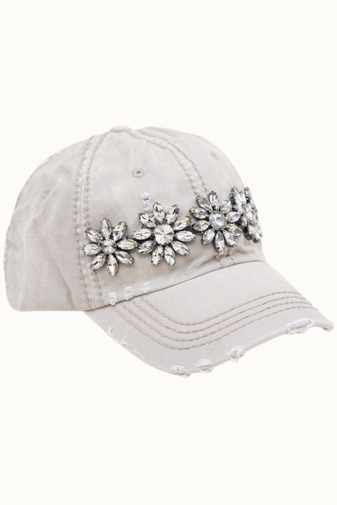 Floral Bejeweled Bling Glitz Distressed Cap, Adjustable