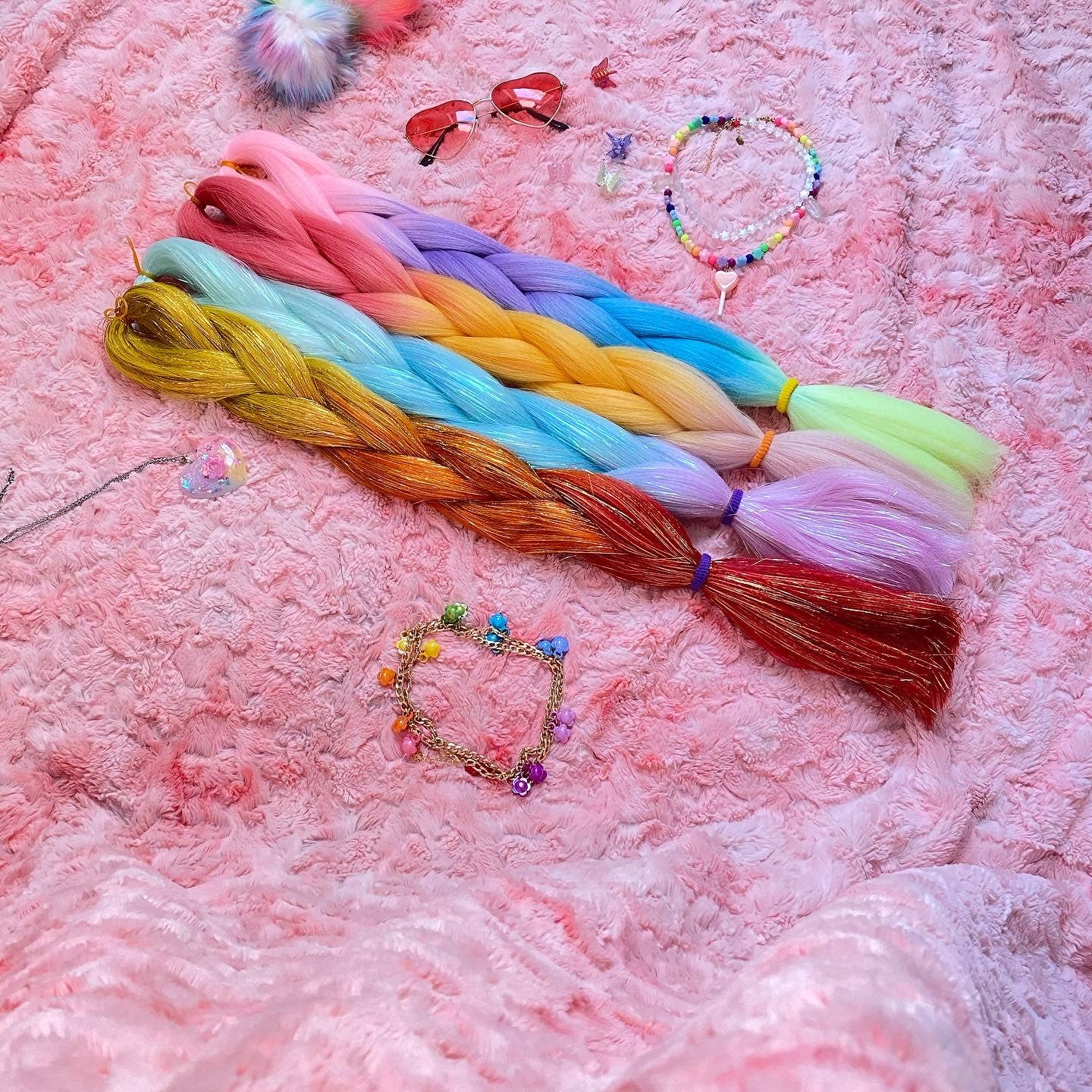 Jellybean purple and aqua straight ombre ponytail hair extensions. Unicorn hair you wear!Unicorn hair you wear. Magic tails are candy-colored, unicorn inspired flip-in ponytail hair extensions. Simply tie your magic tail over your own ponytail for an purple to pink ombre look that will turn heads every where you trot. Comfortable to wear all day. High quality hair is soft and silky.