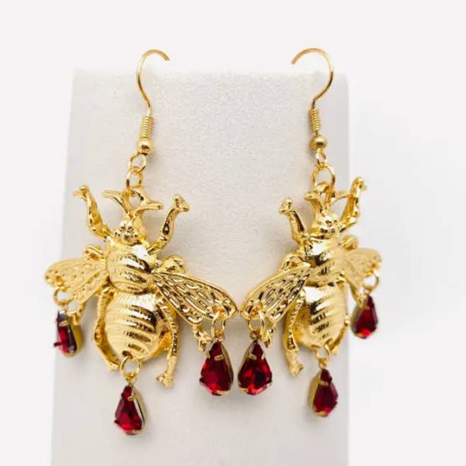 Golden Big Bee and Ring Pendant Earrings