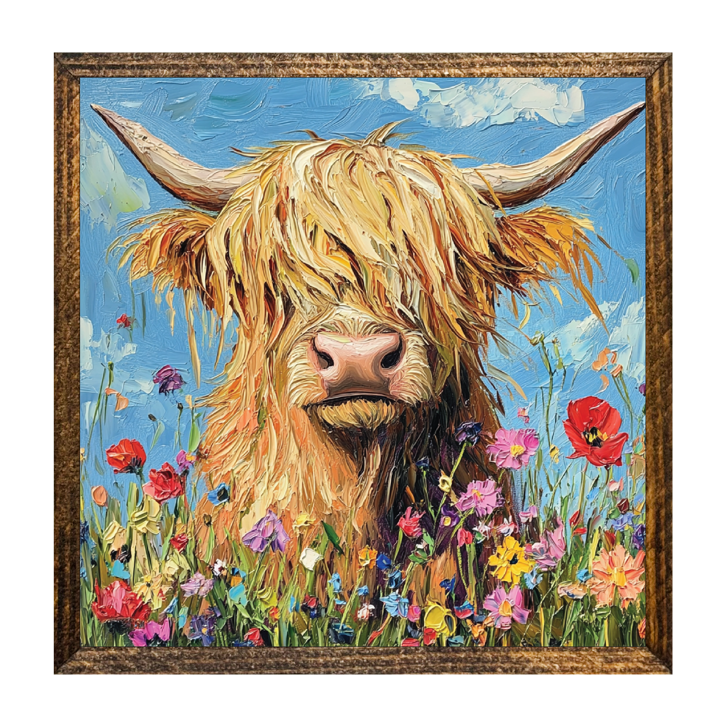 Transform your space with the rustic charm of our art print featuring an endearing Highland cow, crowned with a festive holly berry wreath, against a striking black background speckled with white like fluttering snowflakes. Hang it in your dining room or kitchen to infuse your home with a cozy, festive atmosphere during the holiday season • Printed with vivid colored inks on cotton canvas mounted on wood • Solid hardwood frame in shown stain colors • Sustainable American oak or alder wood • Made in the USA in our Utah studio • MINI 6" tall x 6" wide x 1.25" deep w/ 1/4" thick frame • SMALL 11" tall x 11" wide x 1.25" deep w/ 1/4" thick frame • MEDIUM 15" tall x 15" tall x 1.5" deep w/ 3/4" thick frame • LARGE 22" tall x 22" tall x 1.5" deep w/ 3/4" thick frame • Signs may have +/-1" variations • All signs can stand on a shelf or table (Medium & Large can also hang on a wall) • Farmhouse style frames have small rustic imperfections that make them unique
