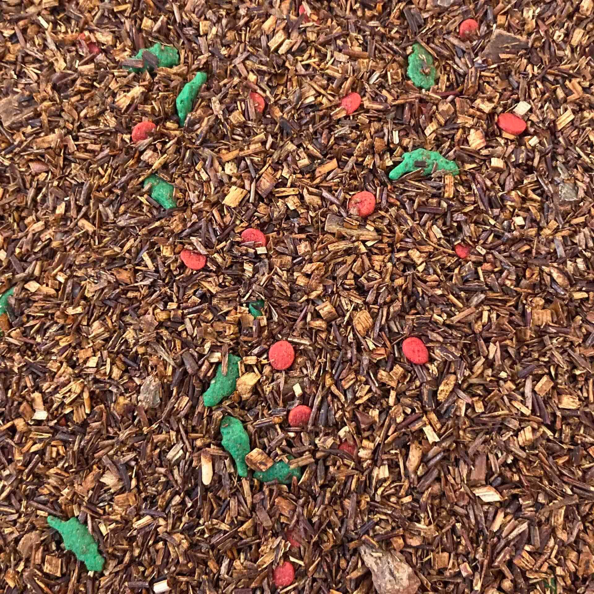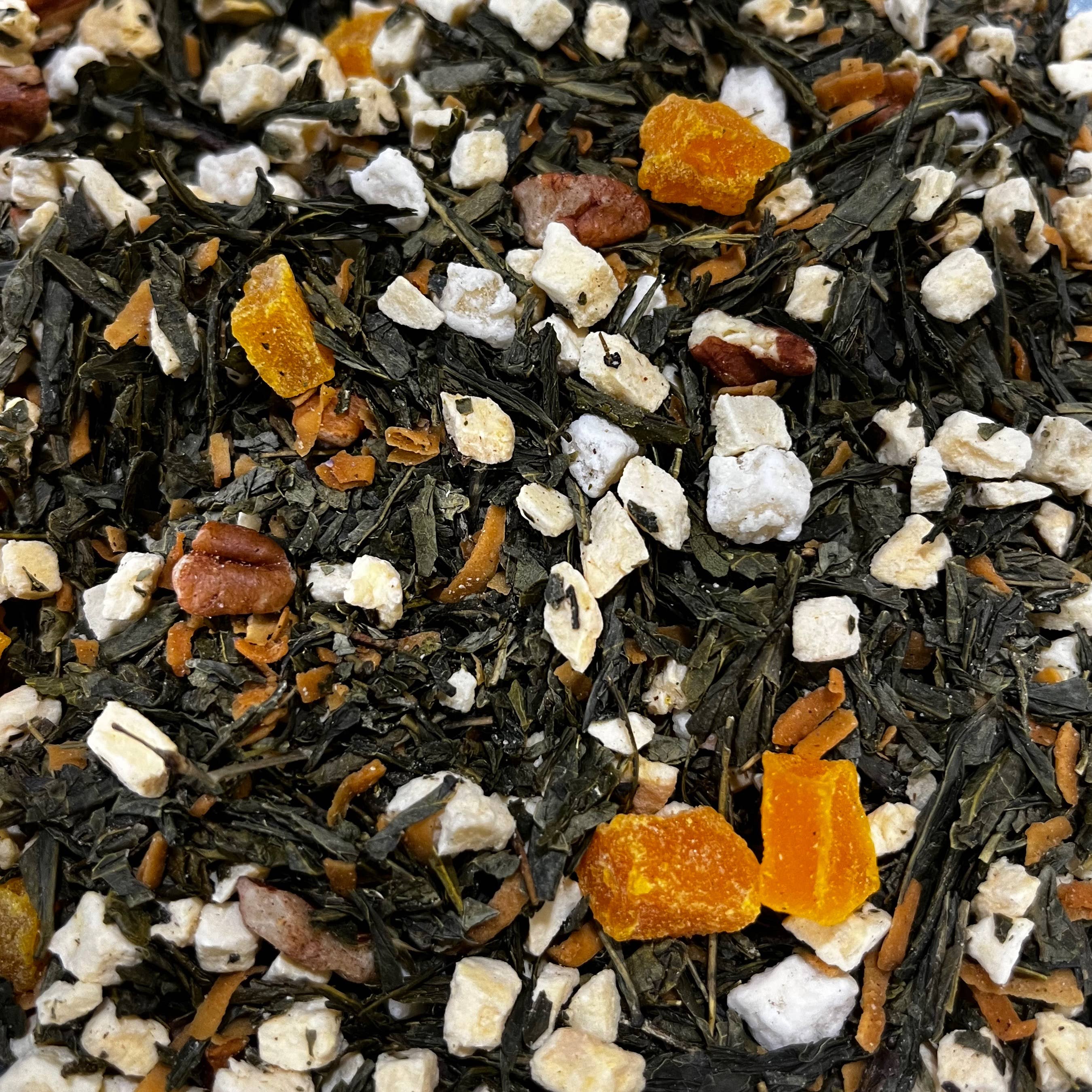 This green rooibos tea features the flavors of fresh peaches and summer berries and includes tiny white chocolate bits. It’s absolutely delicious both hot and cold.