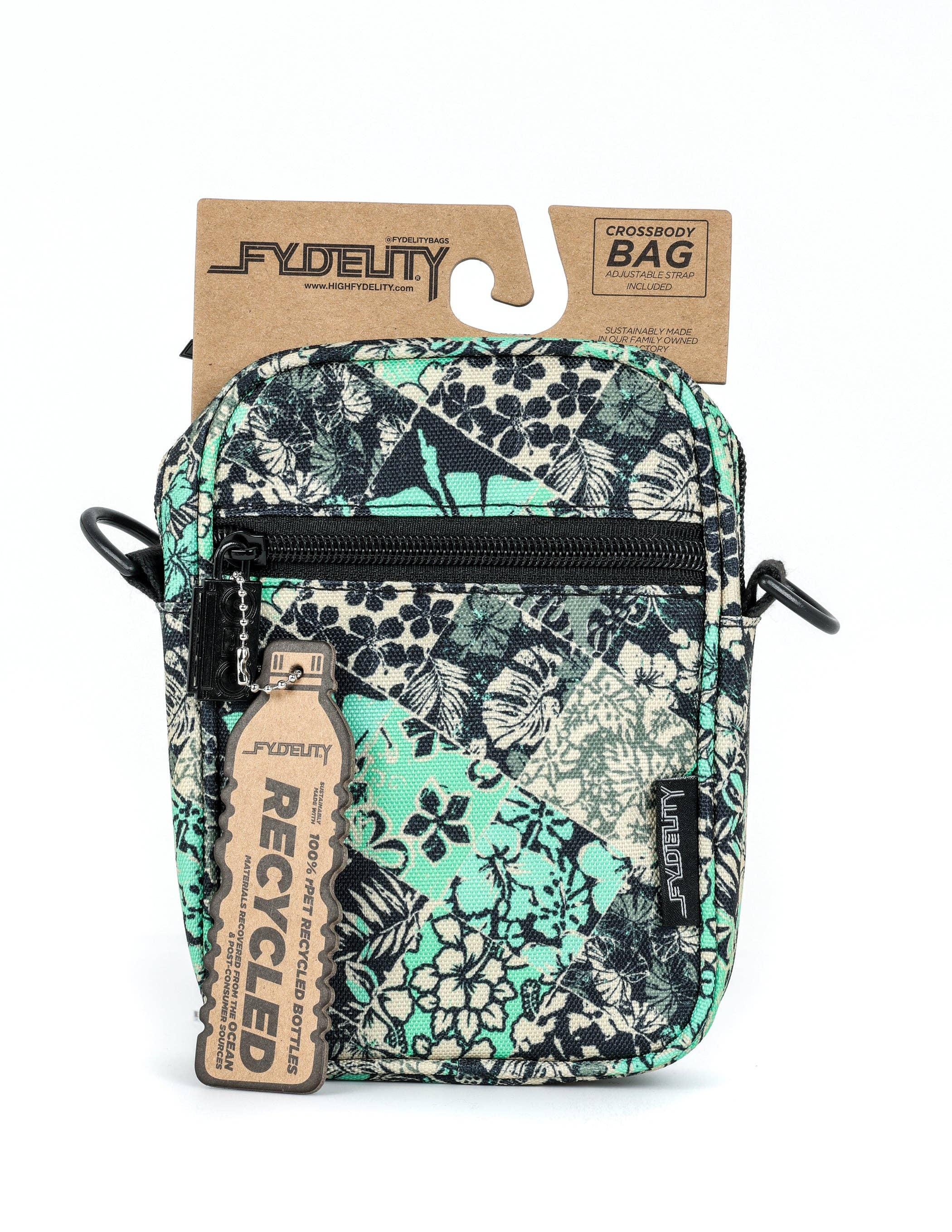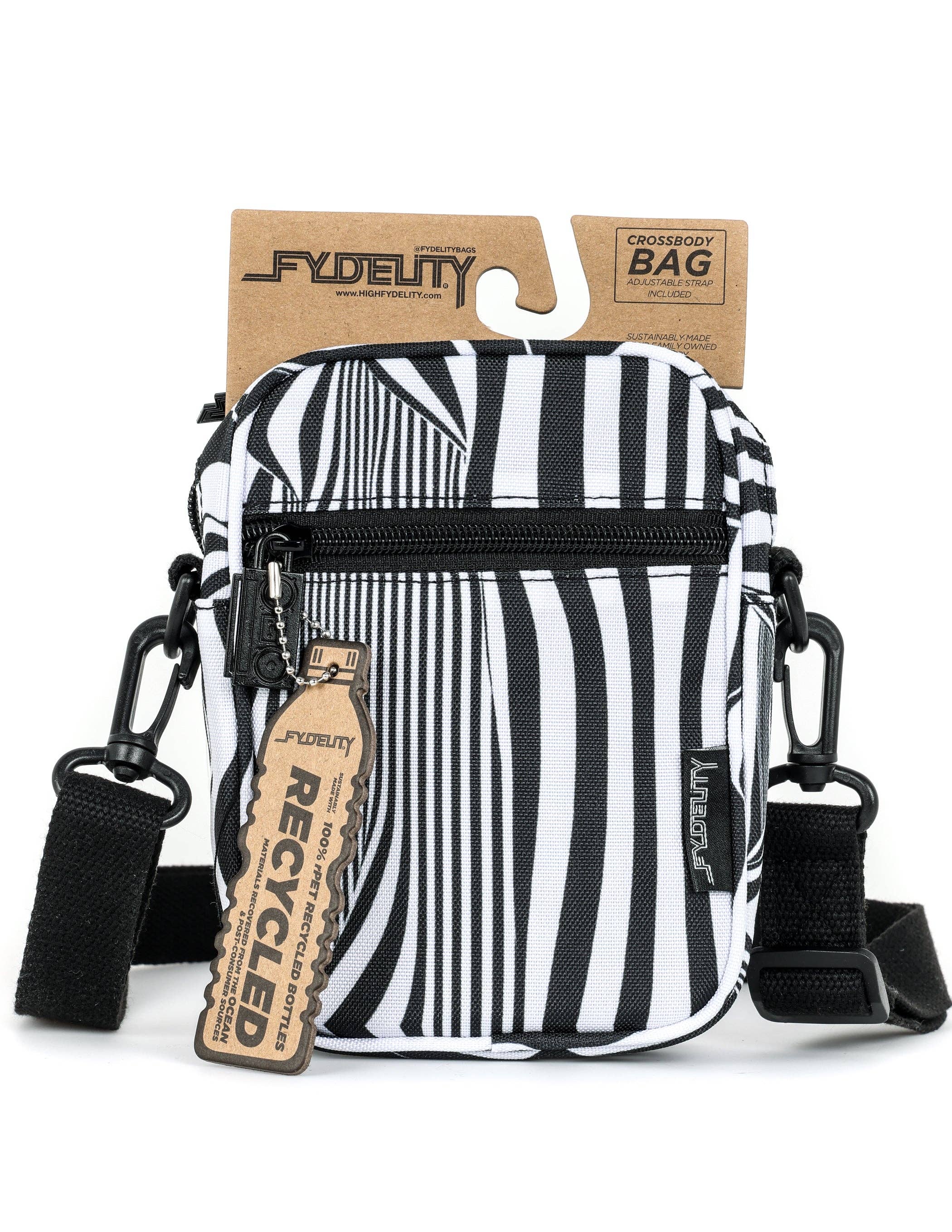 FEATURES * Eco-Funky Materials: Made from 100% post-consumer recycled rPET polyester, this bag is a true green machine. * Retro Fresh Designs: Sublimation printed with cool, old skool designs—it’s your favorite retro playlist in bag form. * Hands-Free Vibes: Strap it on and keep your hands free for dancing, snapping pics, or just living it up. * Adjustable Strap Magic: Easily adjust from casual to chic to match your daily vibe. * Versatile Storage Options: Organize everything from your backstage passes to your secret stash with multiple pocket options. * Sustainably Made: Crafted in our family-owned factory, blending eco-conscious manufacturing with trendy design. SPECIFICATIONS * Dimensions: 8" x 6" x 2" (20.3 cm x 15.2 cm x 5.1 cm) * Volume: Approximately 2.4 liters * Strap Length: Adjustable from 26" to 52" * Pocket Details: Main pocket with a double zipper Inside slip pocket Front zipper pocket MINI BRICK BAG Retro Fresh "Peep, Peep, y'all! Freak, freak, ya'll. So fresh, y'all. To the beat y'all." FYDELITY's Mini Brick Bag is dropping those serious throwback vibes. It's decked out with sublimation printed designs that scream old skool cool. Imagine if your fave retro playlist morphed into a bag—this would be it! So, go ahead, wave your hands in the air like you just don't care, 'cause this bag's got the perfect amount of flair to make your outfit poppin'! Eco-Funky Here’s the tea, spilled fresh: The Mini Brick Bag isn't just any crossbody; it’s a veritable green machine. Made from 100% recycled vibes (yeah, that’s post-consumer rPET polyester), this eco-hero is keeping it 100—real sustainable, real chic. Proudly crafted in our fam-owned factory, this bag brings eco-funky to your daily grin