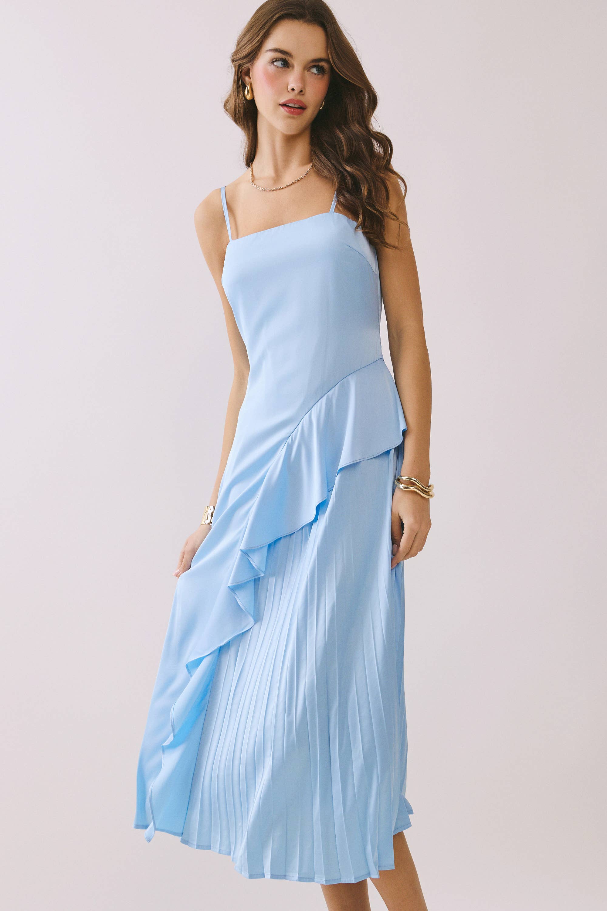 This smocked ruffle-hem midi dress is a perfect blend of feminine charm and casual elegance. Featuring a smocked bodice for a flattering and comfortable fit, this dress flows gracefully into a flared midi-length skirt. The open-back design with ruched straps adds a playful and modern touch, while the ruffle hem detail completes the look with a soft and romantic flair. Ideal for brunches, garden parties, or leisurely strolls, this dress is versatile and effortlessly stylish. Features: Smocked Bodice: Provides a secure, stretchy fit for all-day comfort. Open-Back Detail: Adds a touch of sophistication and modern style. Ruched Straps: Enhance the design with an elegant texture. Ruffle Hem: Adds playful, feminine movement to the dress. Midi Length: A timeless silhouette that flatters any occasion.